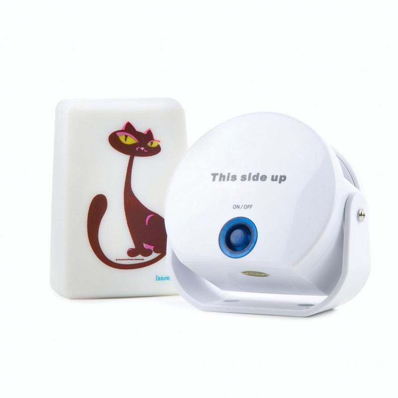 Cat DoorBell består av en vädertålig sensor som du placerar utanför dörren eller fönstret och en dörrklocka som både ringer och blinkar när katten står utanför.