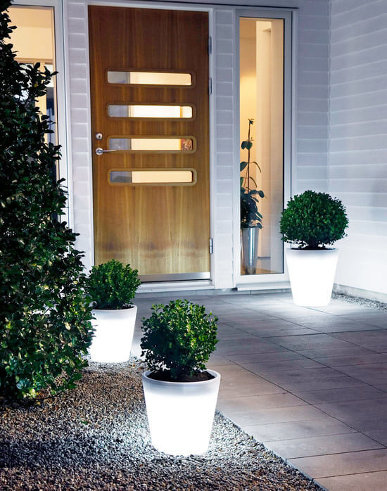 Solcellslampor i form av krukor eller led lampor leder besökaren till entren.