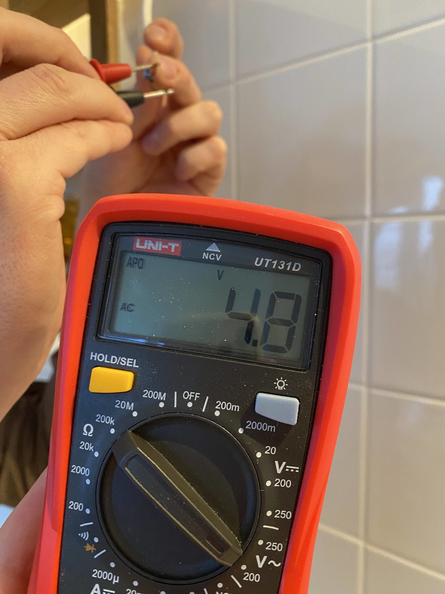 på fotografierna mäter du växelspänning – vad blir det om du mäter med likspänning? (antar att du mäter vid max uppdimmad belysning på de andra två spottarna)