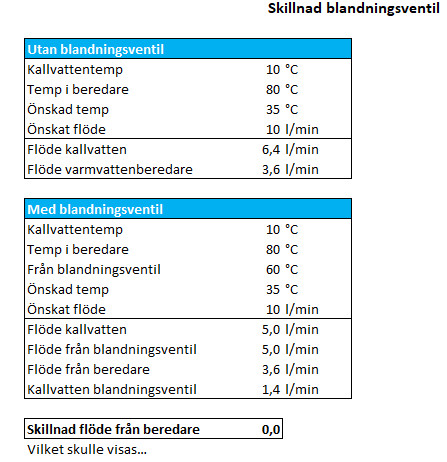 Fotnot: Oavsett hur turbulensen ser ut i beredaren, eller rentav om det ligger en gammal TURBO i den så påverkar det inte energiflödena. Så länge termostatblandaren "tar det den behöver" och beredaren inte är så vansinnigt dålig att inkommande kallvatten går mer eller mindre rakt ut igen utan någon som helst blandning eller skiktning kommer beräkningarna stämma.