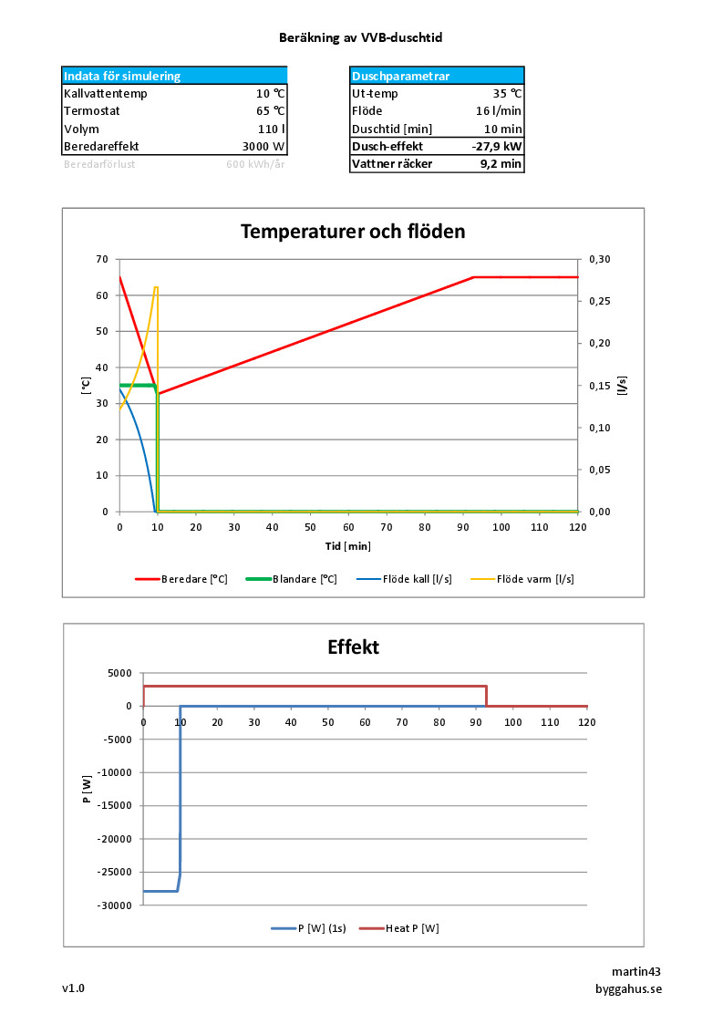 Om det är 16 l/min i trådskaparens dusch, 35 grader varmt och 110 l 65C i beredaren tar det 9,2 min sedan blir det kallare och kallare. Om TS istället byter till 10 l/min kan hen duscha 15 min utan att det blir kallt. Sedan tar det 70 minuter att ladda om beredaren om den ger 3 kW.