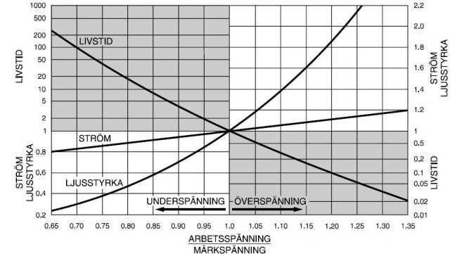 Intressant! Där framgår med all önskvärd tydlighet dels att strömmen är relativt konstant men också att verkningsgraden är mycket beroende av spänningen och att man faktiskt verkar få mer för ljus för pengarna om man kör lite svagare lampor på överspänning och därför byter dem oftare...mulpac skrev: