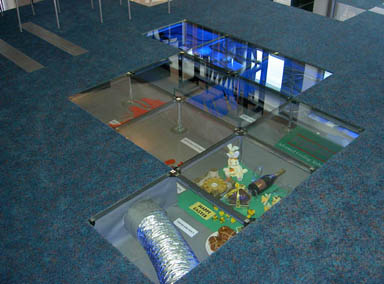 Jag kan tyvärr inte hitta länk till den jag har men den används i golv på serverparker där de bygger upp stora rutnät med 60x60 inläggskivor men för att du ska kunna hitta kablar under golvet så är vissa skivor i glas.