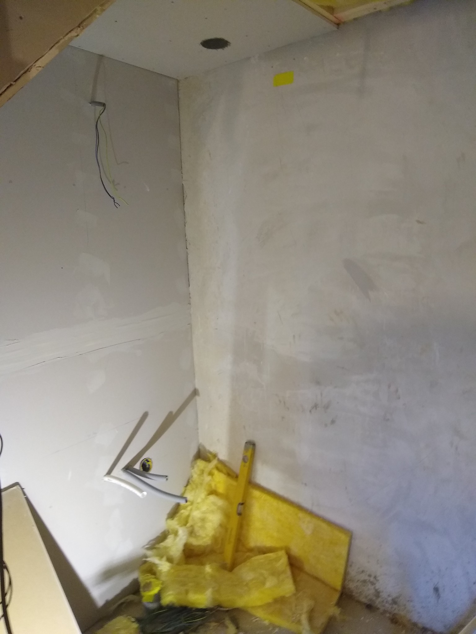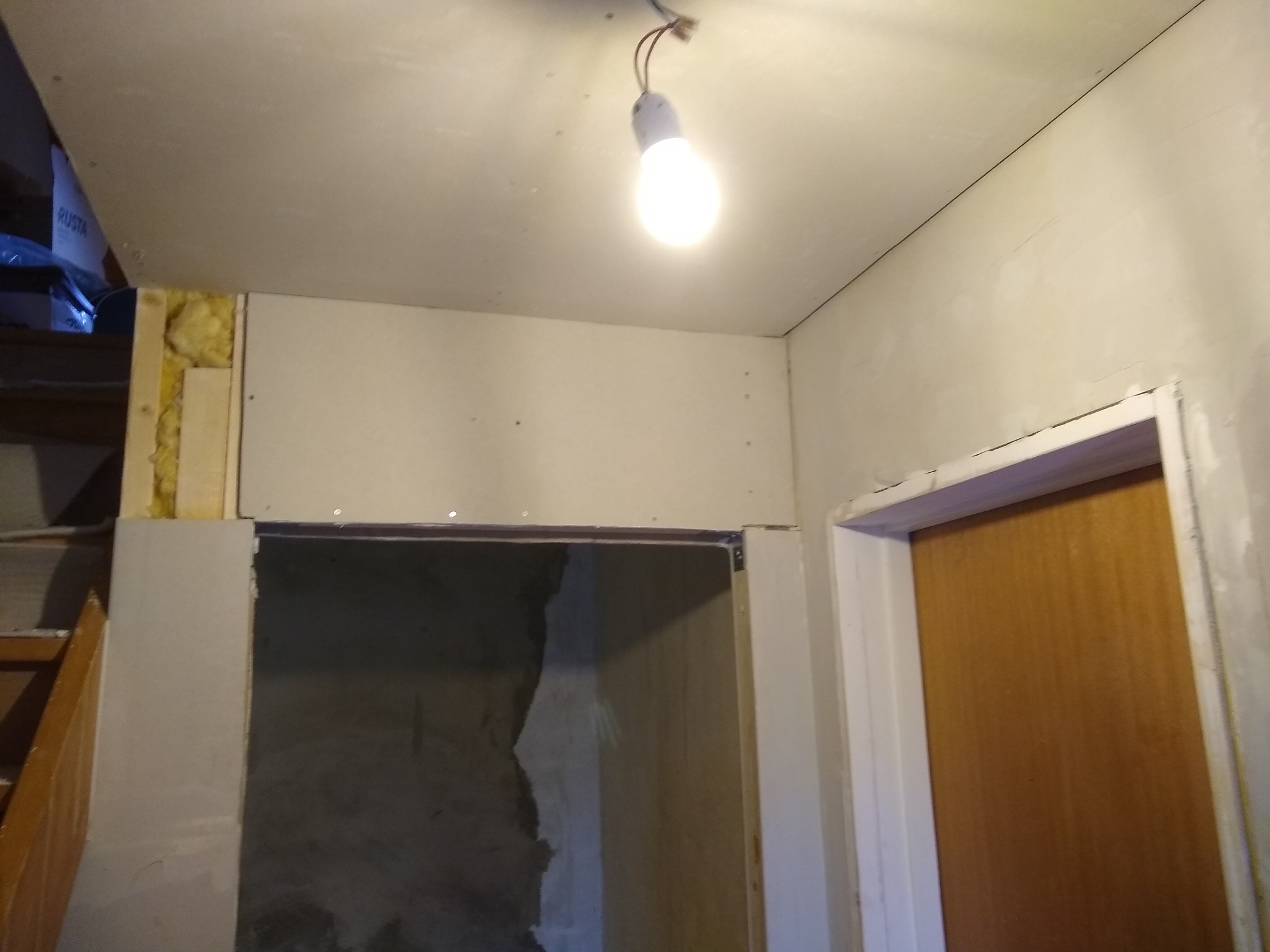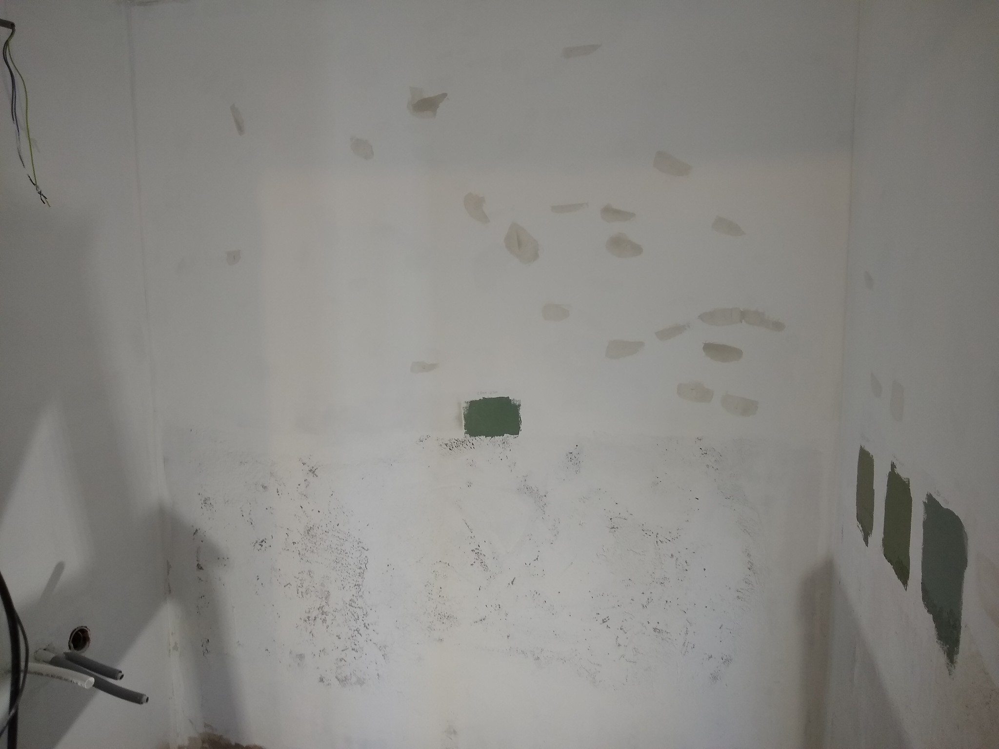 Sen byggde vi upp skiljeväggen och dörrhålet igen samt gipsade allt och testade lite provmålningar.