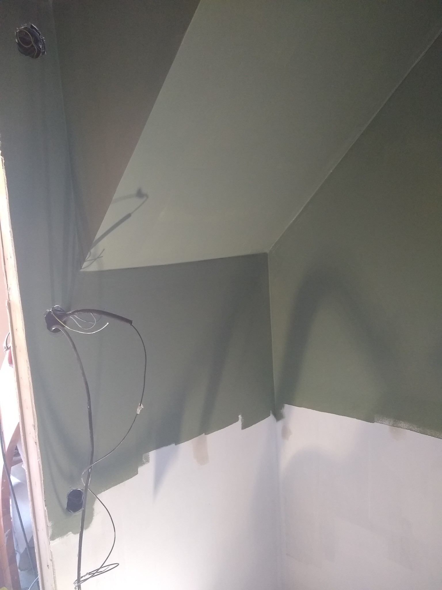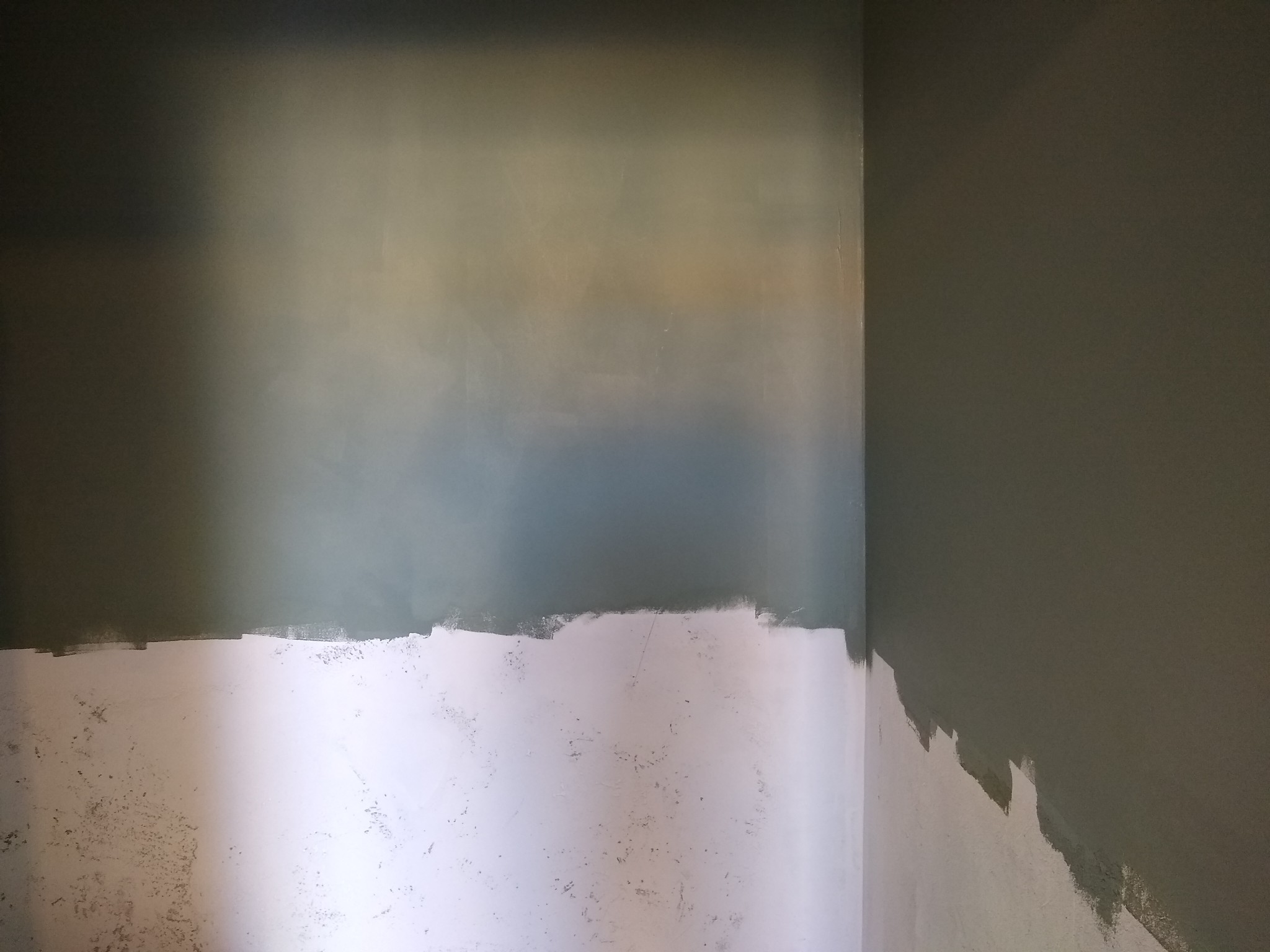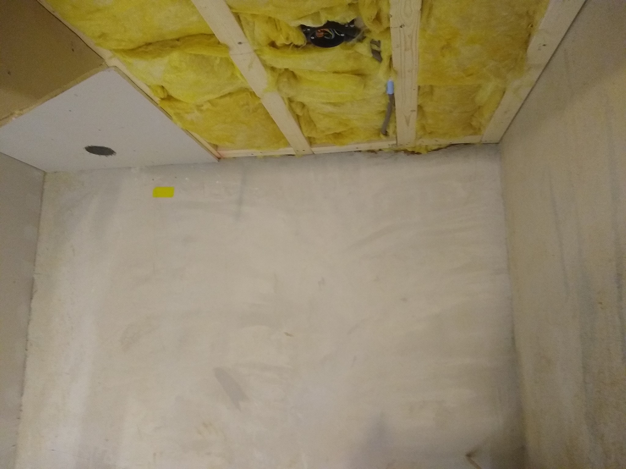 Sen byggde vi upp skiljeväggen och dörrhålet igen samt gipsade allt och testade lite provmålningar.