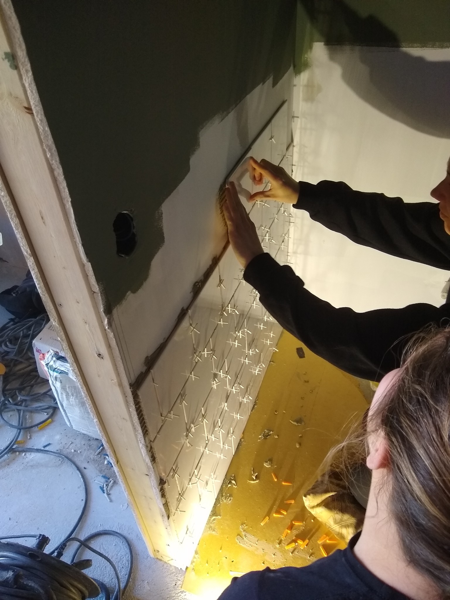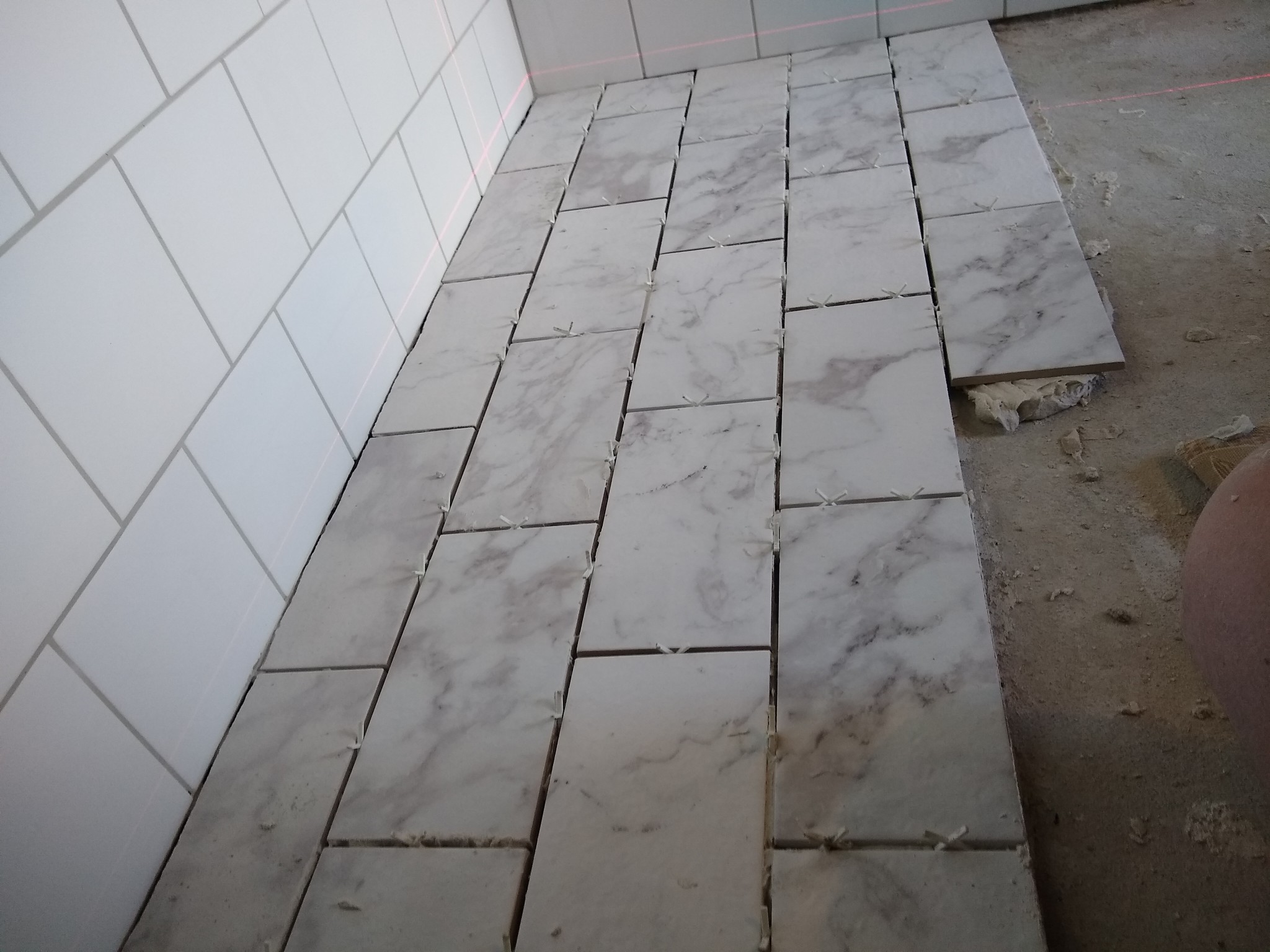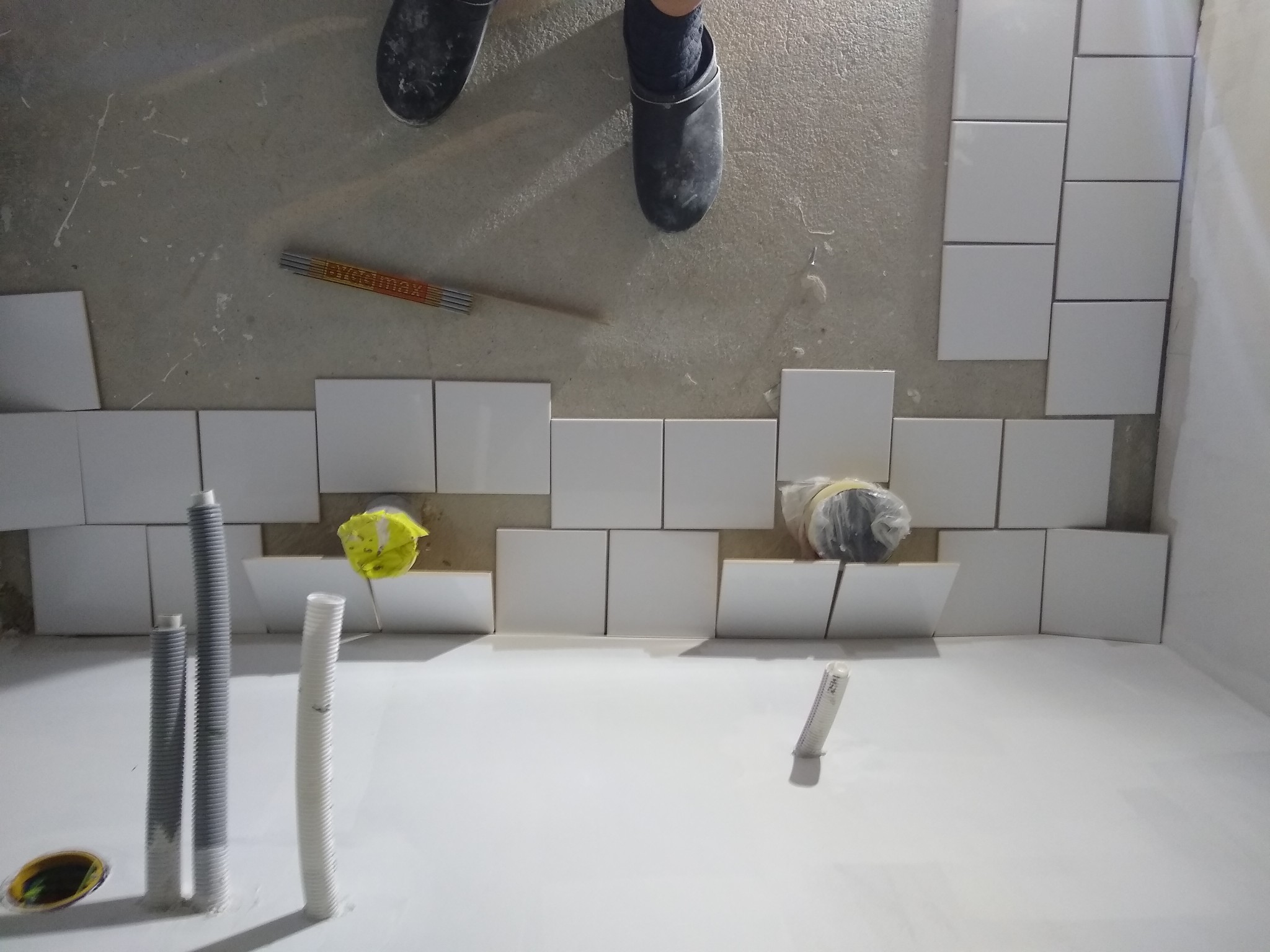 Det ska vara halvstenförband så då måste man tänk en extra gång innan man sätter första kaklen.
