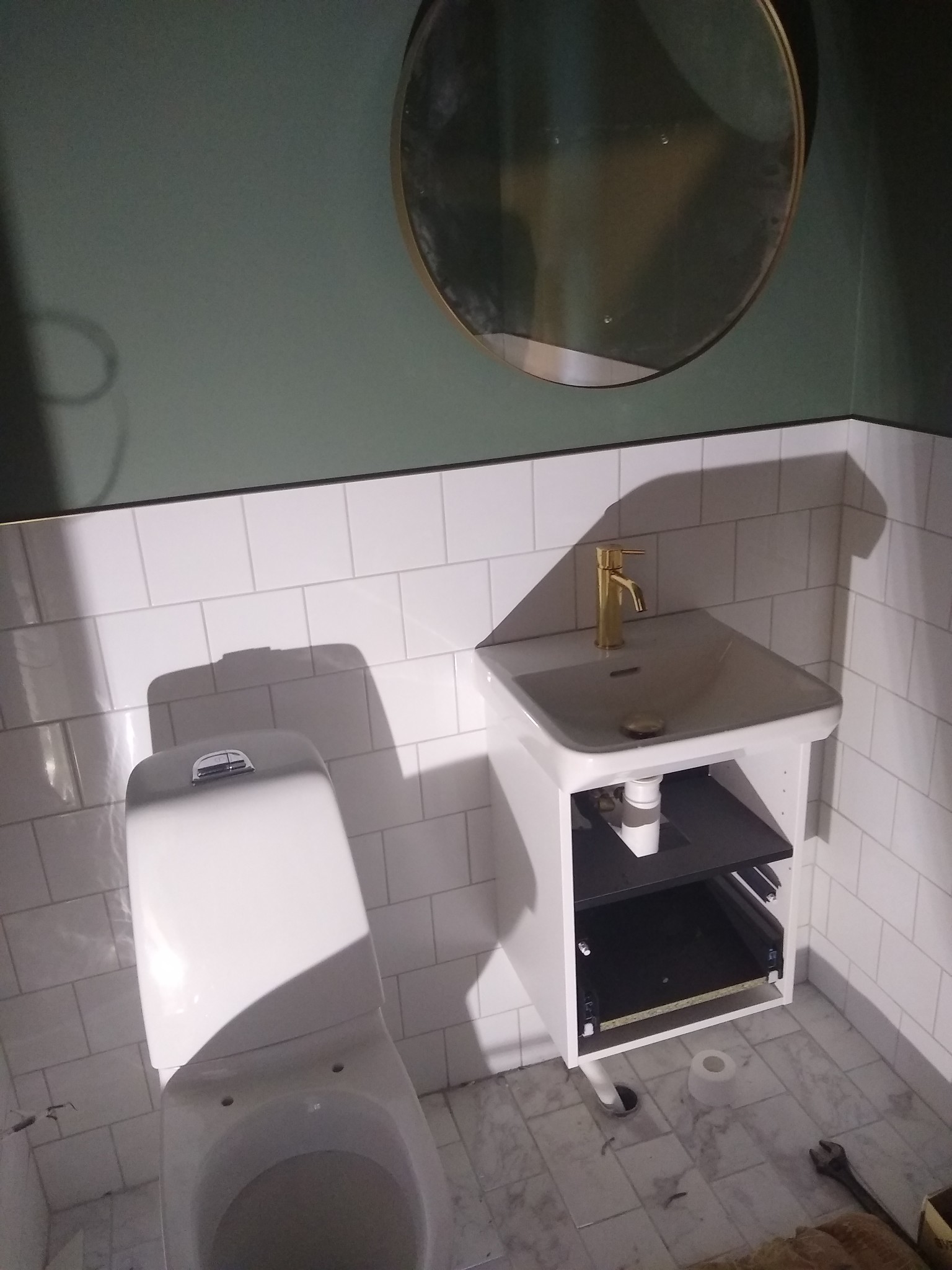 Sambon fick som vanligt bestämma allt, dock hade vi redan köpt en Jenny spegelskåp från svedbergs i mässing så fick den fick styra. Hittade den för ca 800kr ny när de byggde om Bauhaus i Malmö.