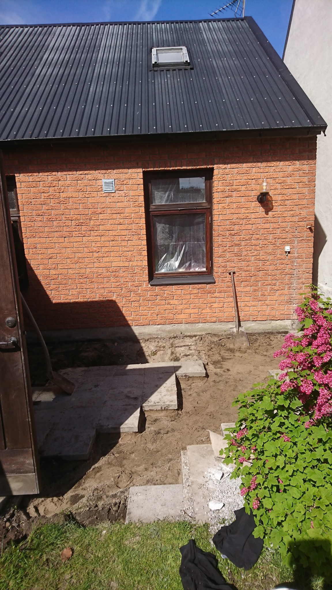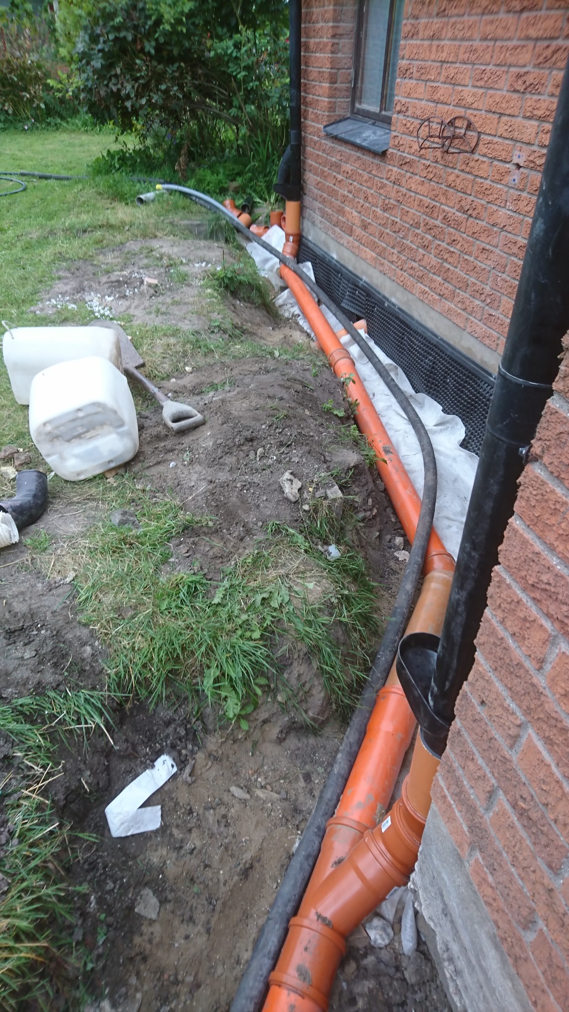 Avloppen var gamla tegelrör så det var lika bra att byta ut allt och när vi grävde hittade vi en gammal brunn ca 1.5 m diameter och 4 meter djup. Passade perfekt för att bli av med vatten från stuprören.