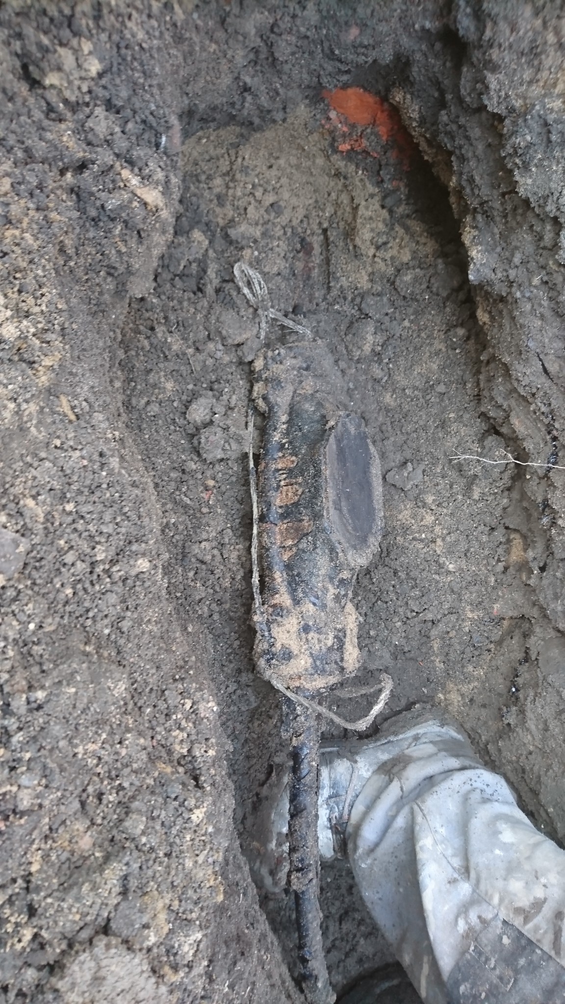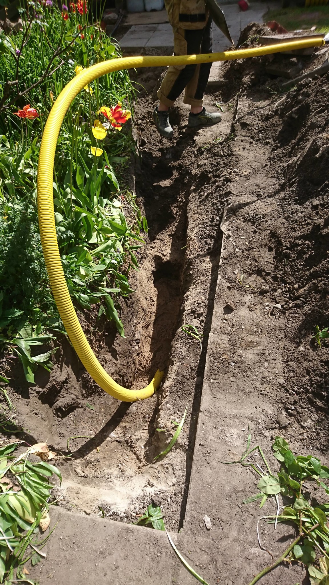 Hade redan sågat ut för ny servis för elen och den gick vid där jag ändå skulle gräva för inkommande vatten. Men var en gammal skarv halvägs ut ändå.