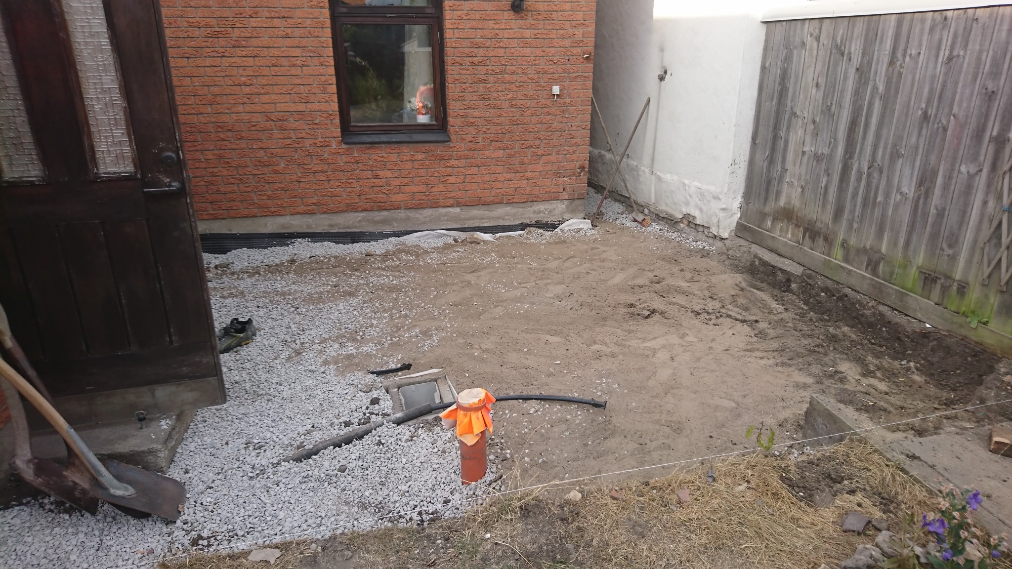 Leveransen med drän och sand har kommit så nu börjar nästa tunga jobb. Ca 13 kubik material och 27 m2 betongsten.