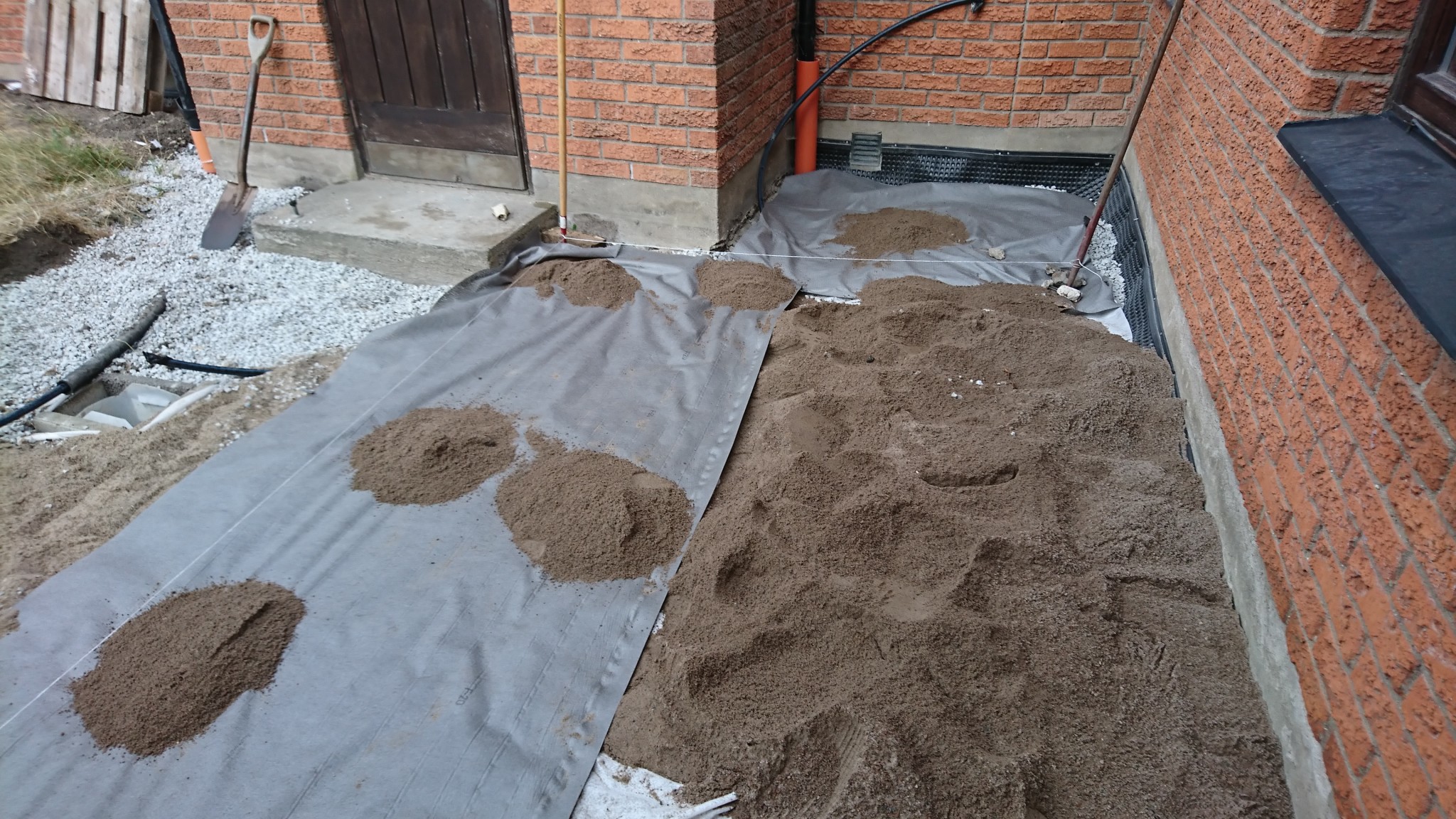 Macadam i botten ca 15 cm sen blev det 25 cm markisloering. Grannens katt smög in och kollade.