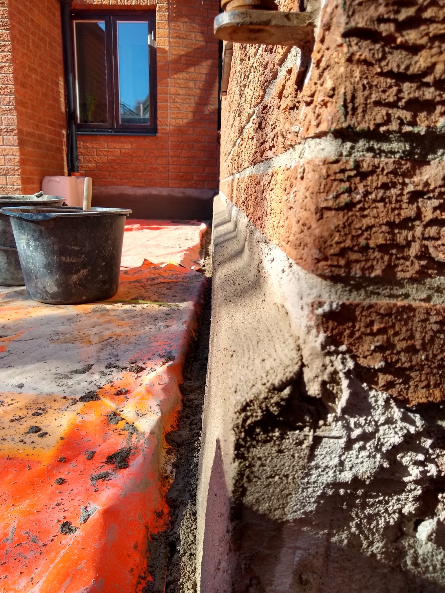 Ville inte ha något cementbruk där nere så det absorberar och håller vatten och sliter i resten av leran som är mellan stenbumlingana men utanför leran är det en platonmatta och isolering samt dränering. Det på sockel är b-bruk.