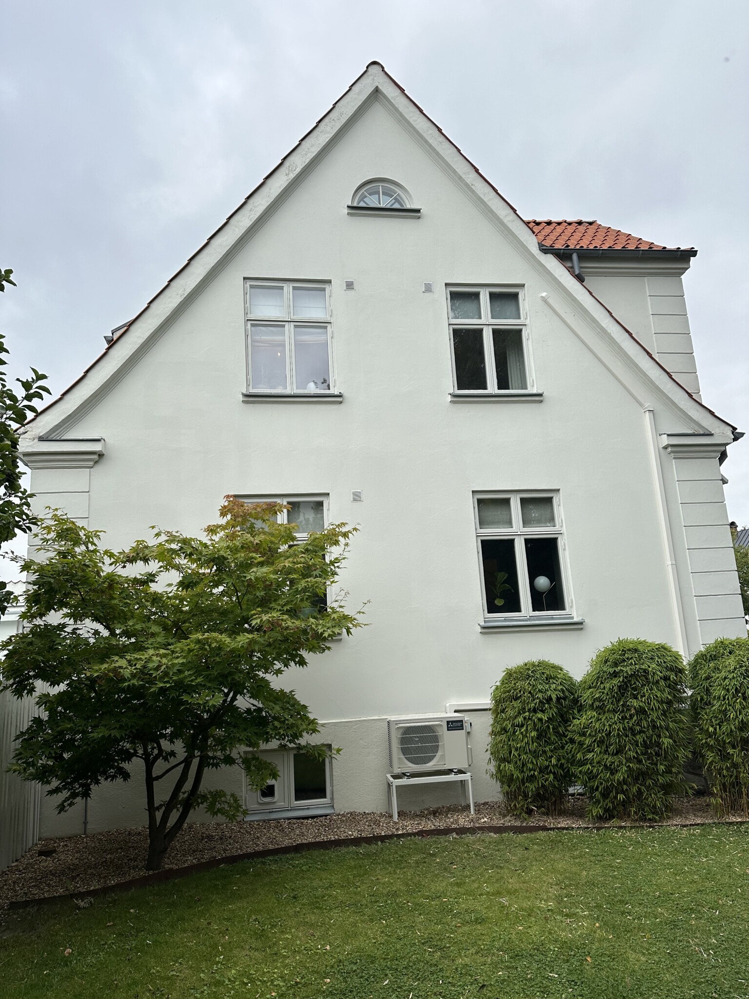 All slang går under panelen på fasaden, upp på vinden med avstick till konvektorerna så det syns inte.