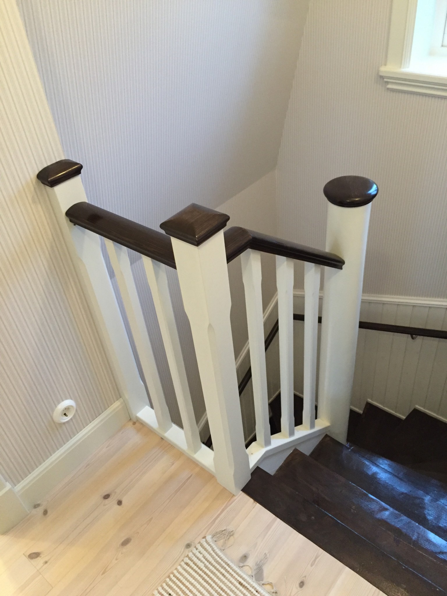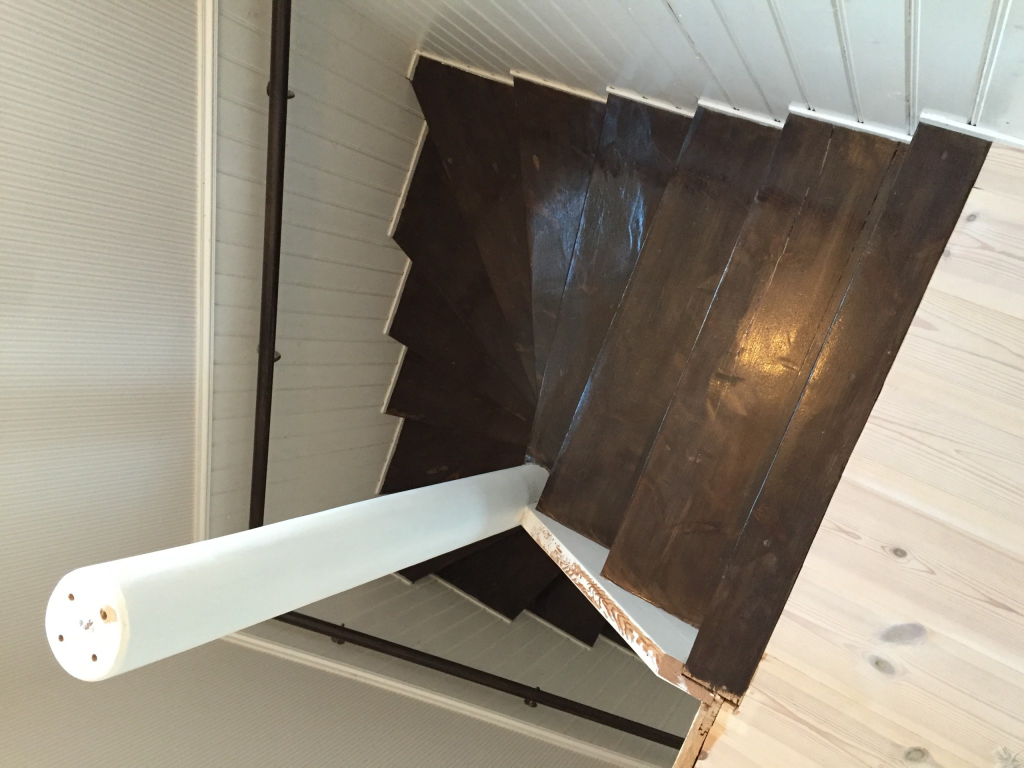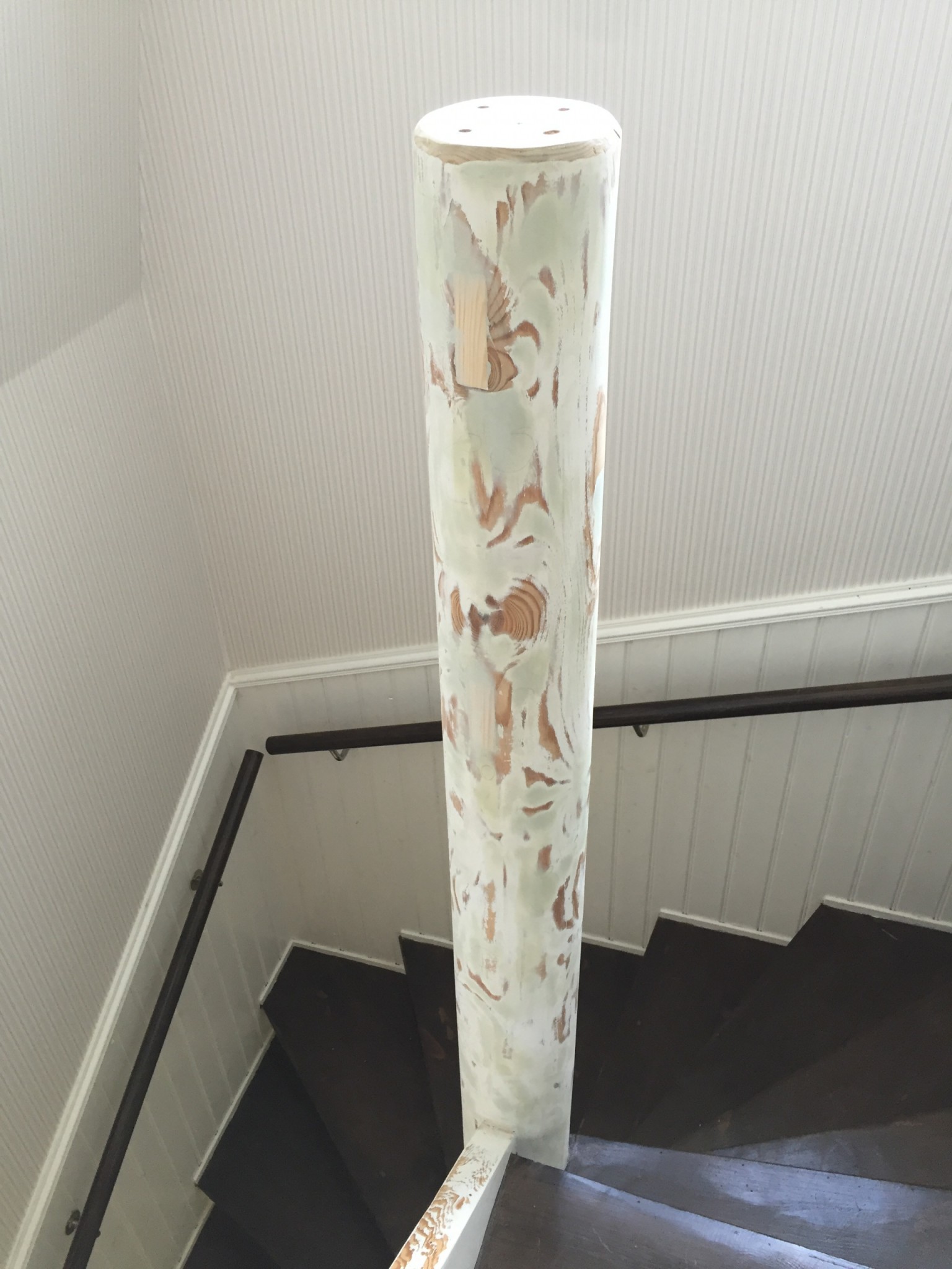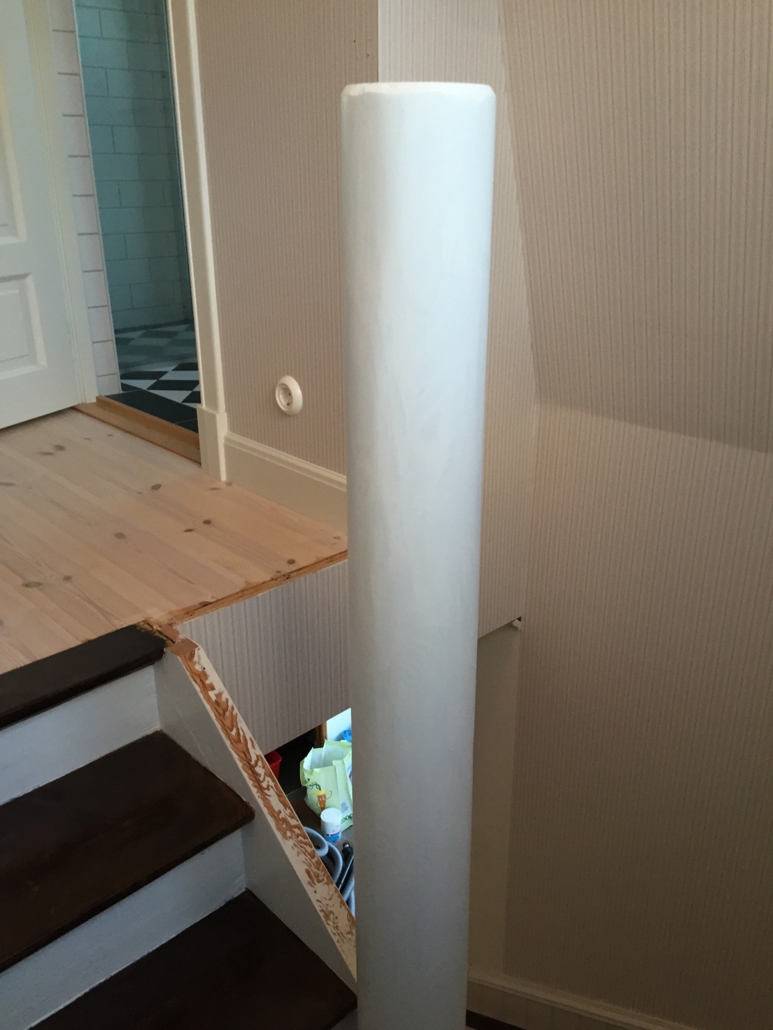 Även den runda stolpen i trappen behövde lite omsorg och lite pluggar för det gamla räcket.