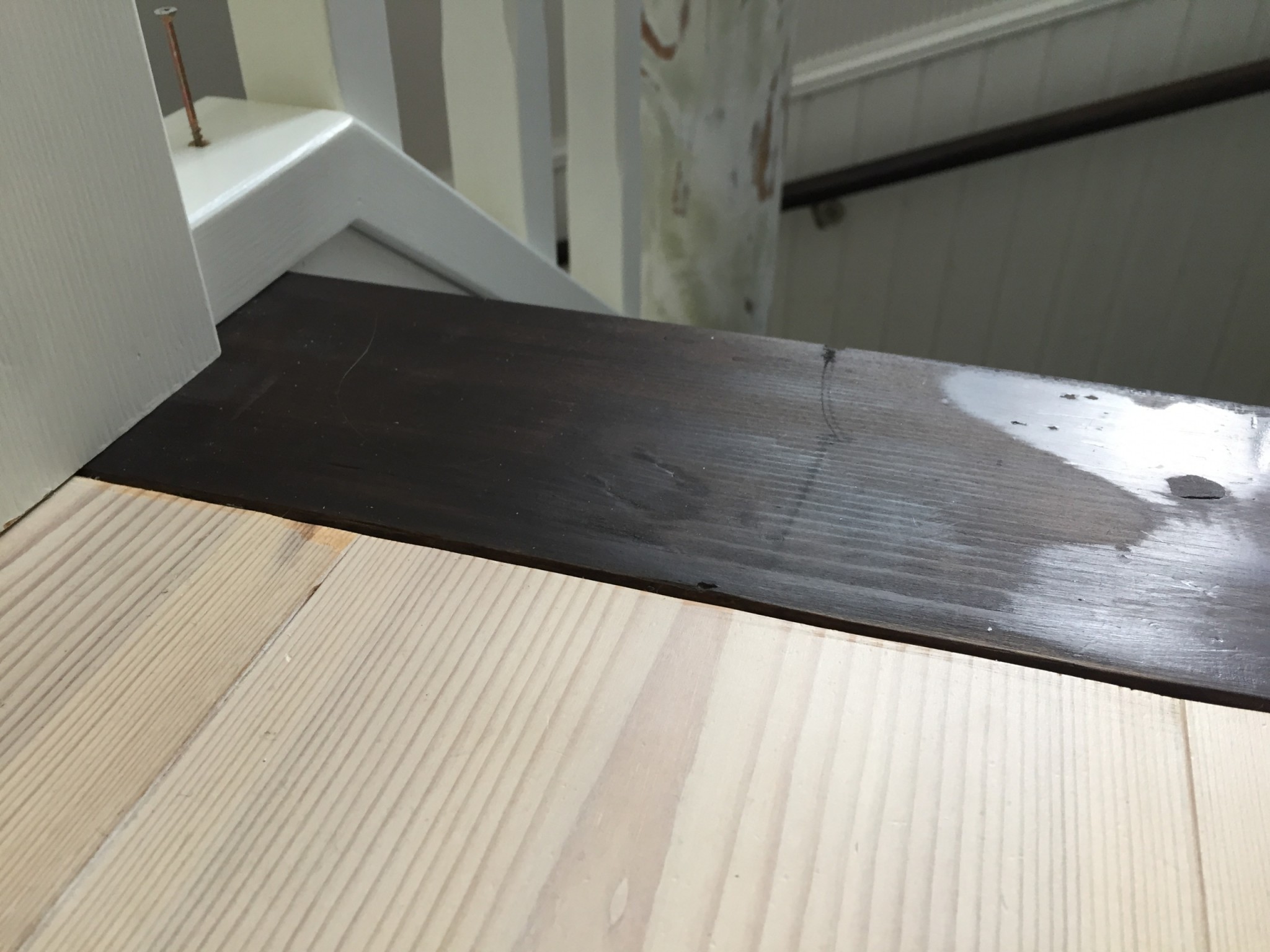 När det nya golvet lades på ovanvåningen fick vi hyvla av en del av det översta trappsteget, fick till ganska liknande bets, den matta delen var hyvlad.