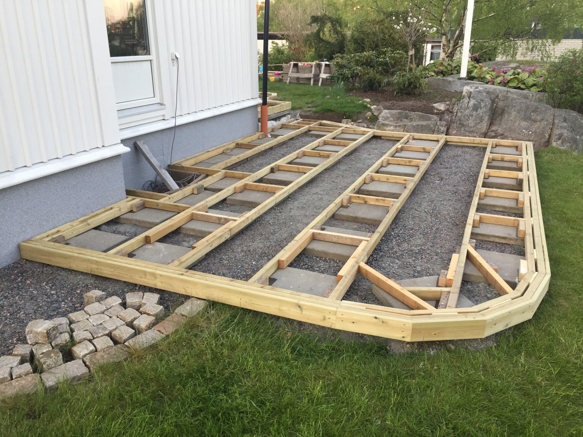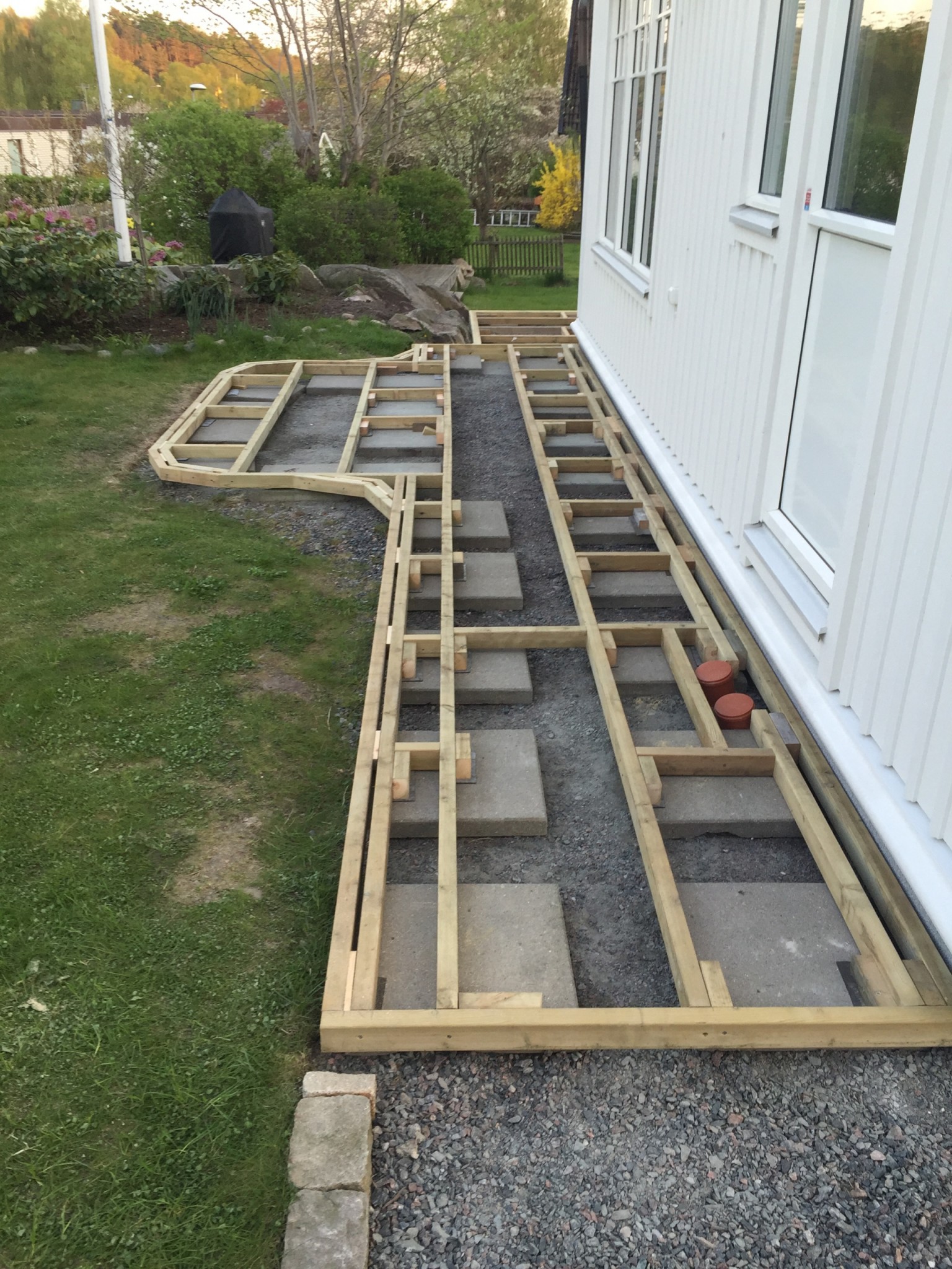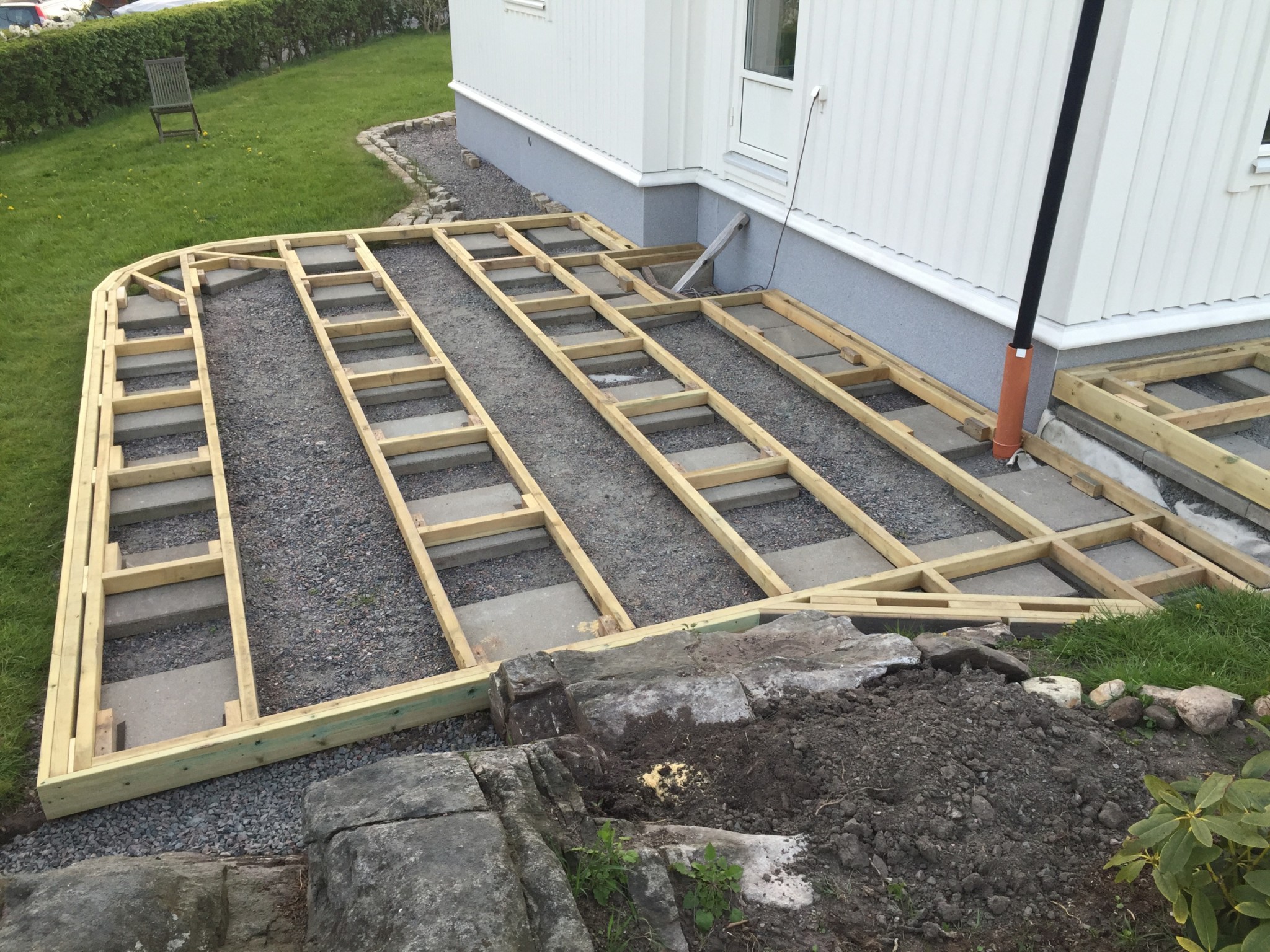 Altanen blir helt flytande dvs ingen del är fäst i grunden/huset, däremot skruvade vi fast en del plattor i regelverket på den avlånga delen för att få lite extra tyngd i det så det skulle ligga still.
