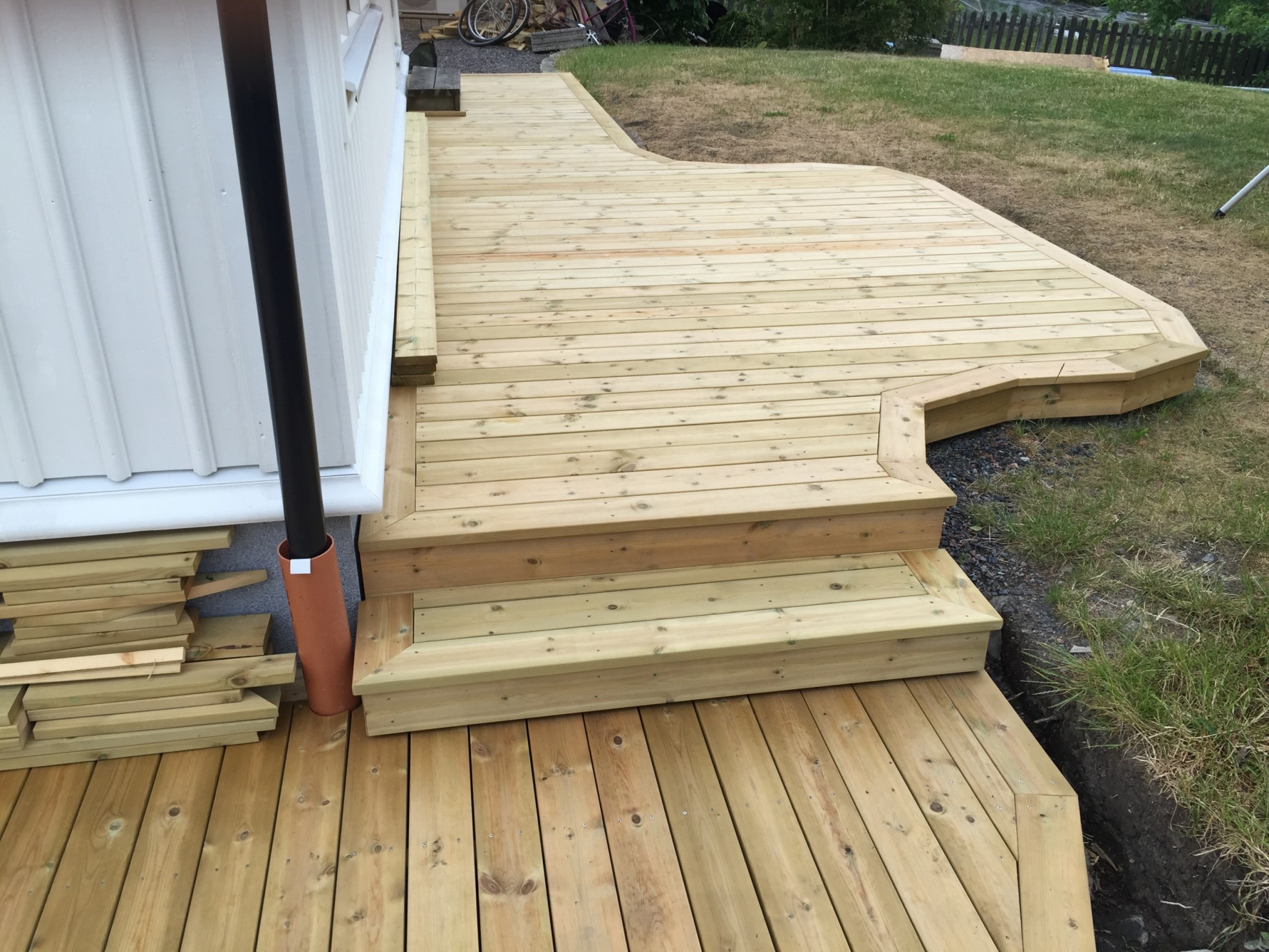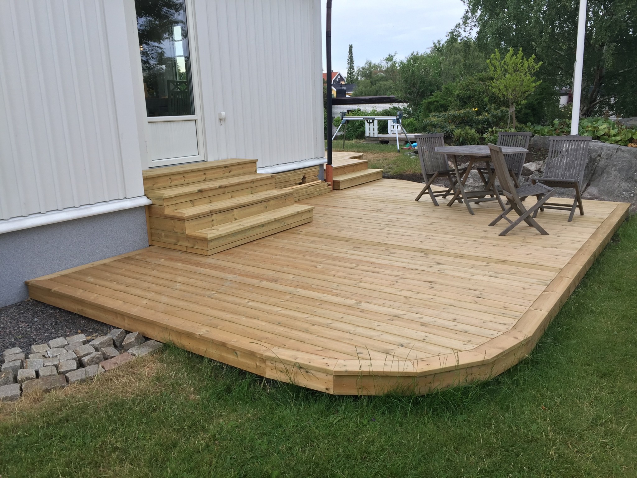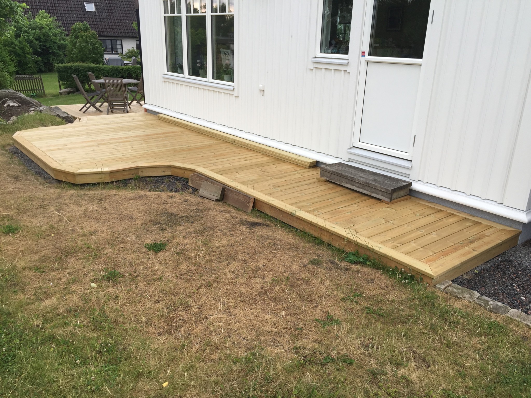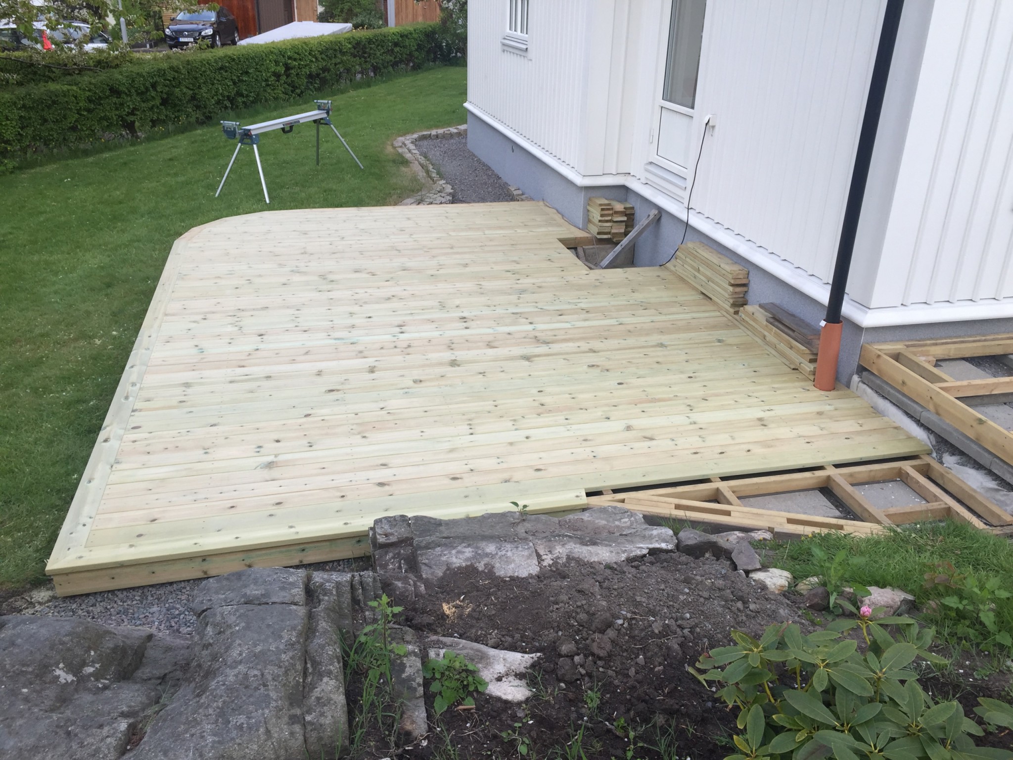 Altanen blir helt flytande dvs ingen del är fäst i grunden/huset, däremot skruvade vi fast en del plattor i regelverket på den avlånga delen för att få lite extra tyngd i det så det skulle ligga still.
