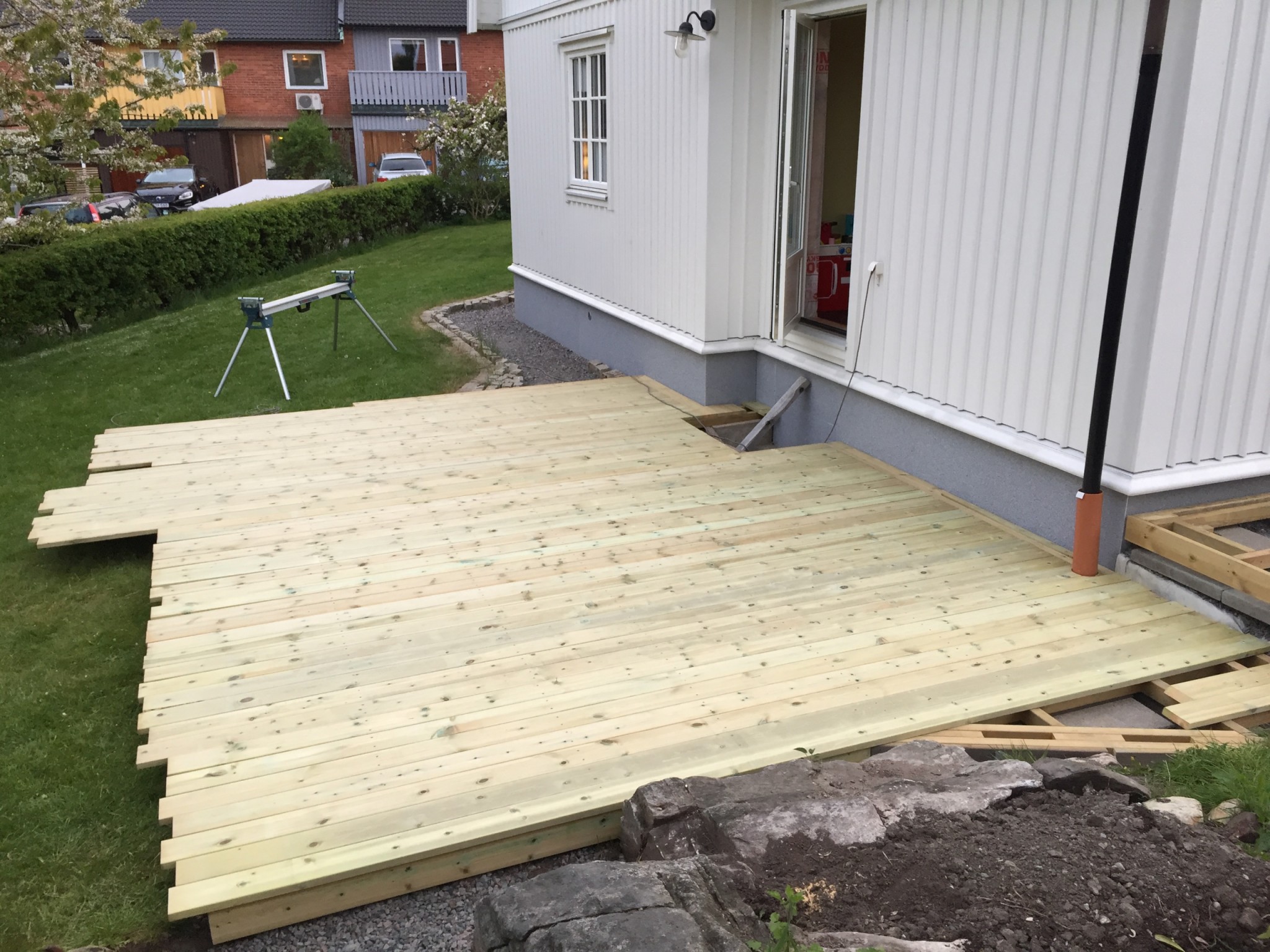 Det andra sommarprojektet var att fixa till altanen. Hade sedan tidigare planerat storlek och grusat + paddat vid dräneringen. Hade ca 100st 50x50x6 plattor som användes som underlag för regelvirket 70x45. Efter lite pill i sketchup så fick vi till en bra layout med cc 60 på reglarna och cc80 mellan uppläggen. Och med en titt i spännviddstabellen som säger max 1,1m för 70 regel (och för 22mm trall) borde det bli stabilt