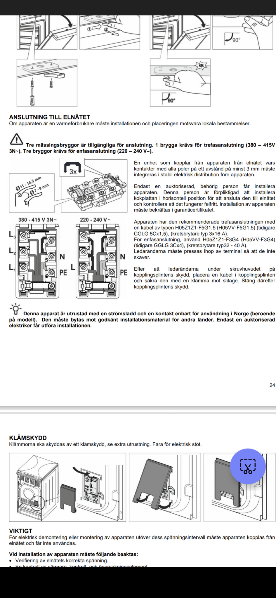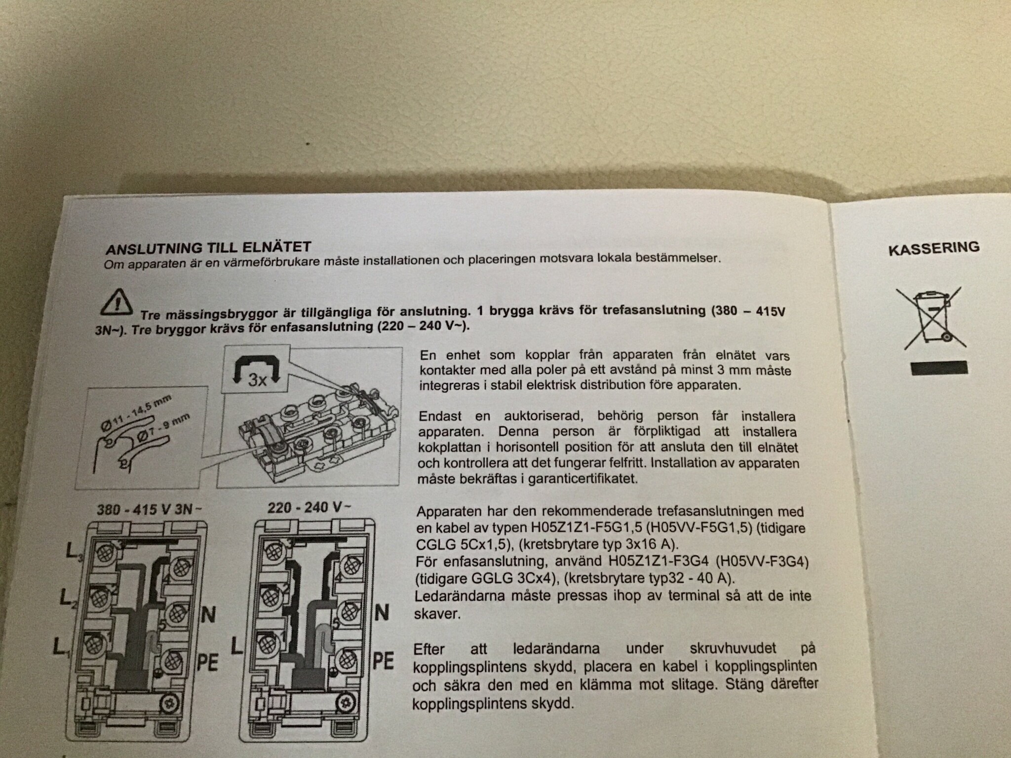 1. I spisens anslutningsdosa ser det ut att vara kopplat för en anslutning till tre faser enligt bilden från manualen.