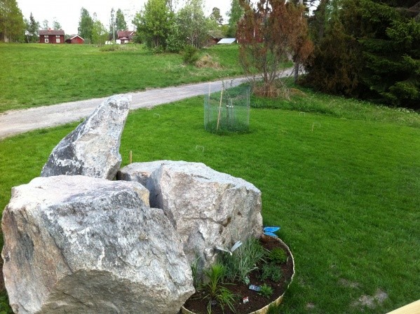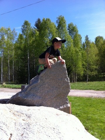 PS Upptäckte idag hur fin utsikt det är egentligen. Bilden på stenen visar lite av utsikten bakom. En stoooor äng, längst bort ser man en liten timmerstuga (bakstuga), några hörullar och skog. Naturskönt...