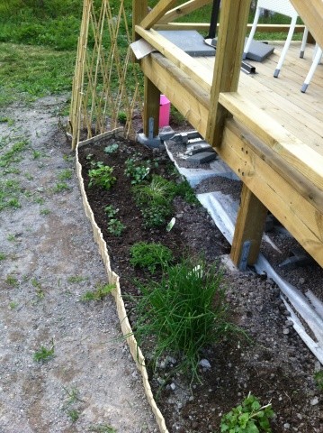 Kryddlandet är klart och består av en hel del roligt. Ananas/salvia, pepparmynta, choklad/mynta, citronmeliss, rabarber, smultron, dill m.m. Till vänster har vi planterat en klätterros.