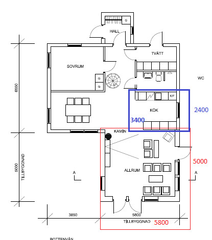 Vi är i slsta fasen att lämna bygglovsritningen för 29 kvm (5800x5000mm =29000 mm) tillbyggnad. Det är vår första tillbyggnad och har inte bott i huset förut så undrar om tillbyggnad (29m) + nuvarande köket (3400x2400=8100mm) total (29000+8100mm=37100 mm) är tillräckligt för en öppen planlösning (kök+matbord vardagsrum) ? Tips gärna hur kan vi ställa köket samt köks, vardagsrummöbler o matbordet smart sätt ? Bor vi göra annat sätt och ändra måttet ?