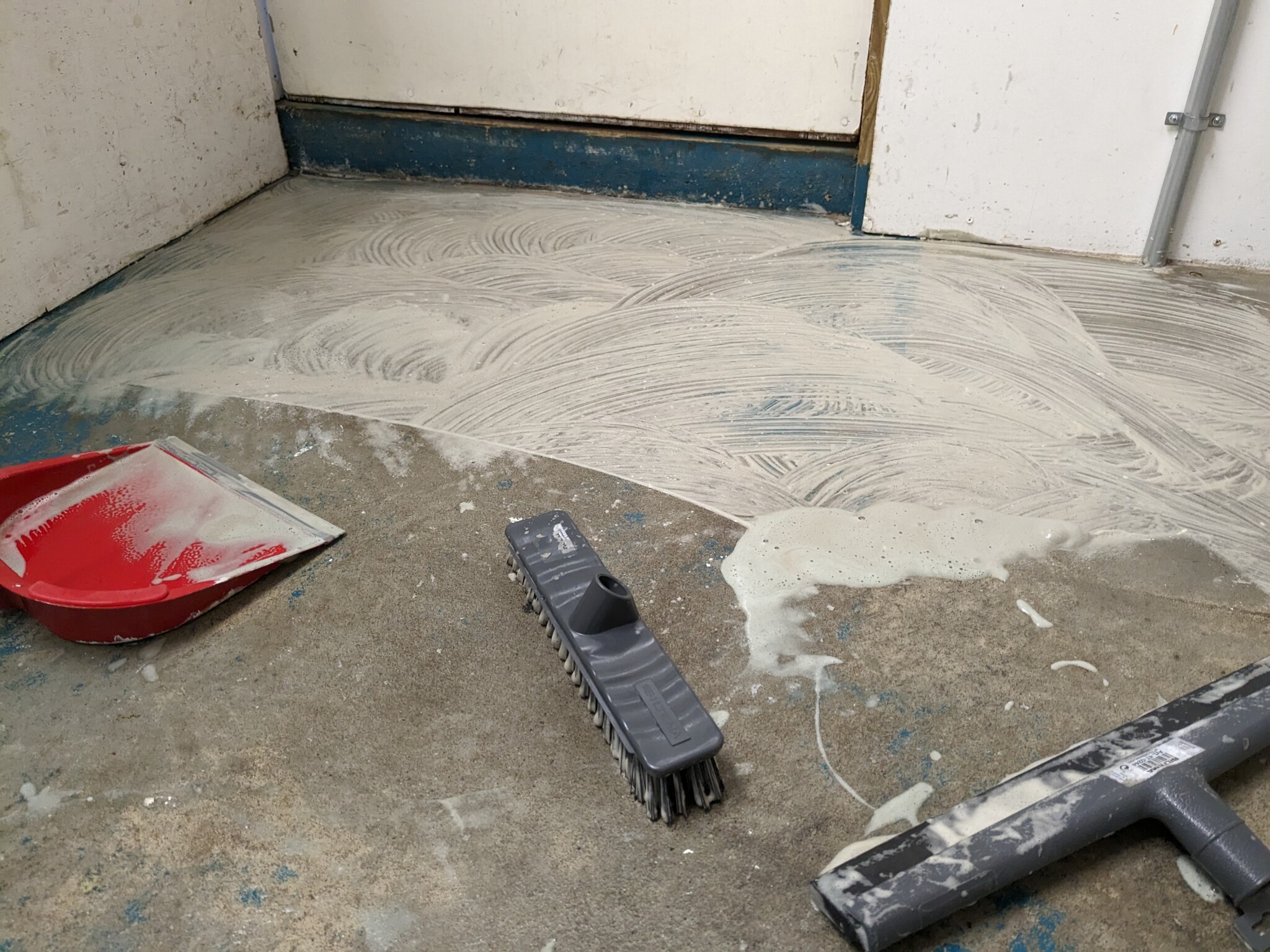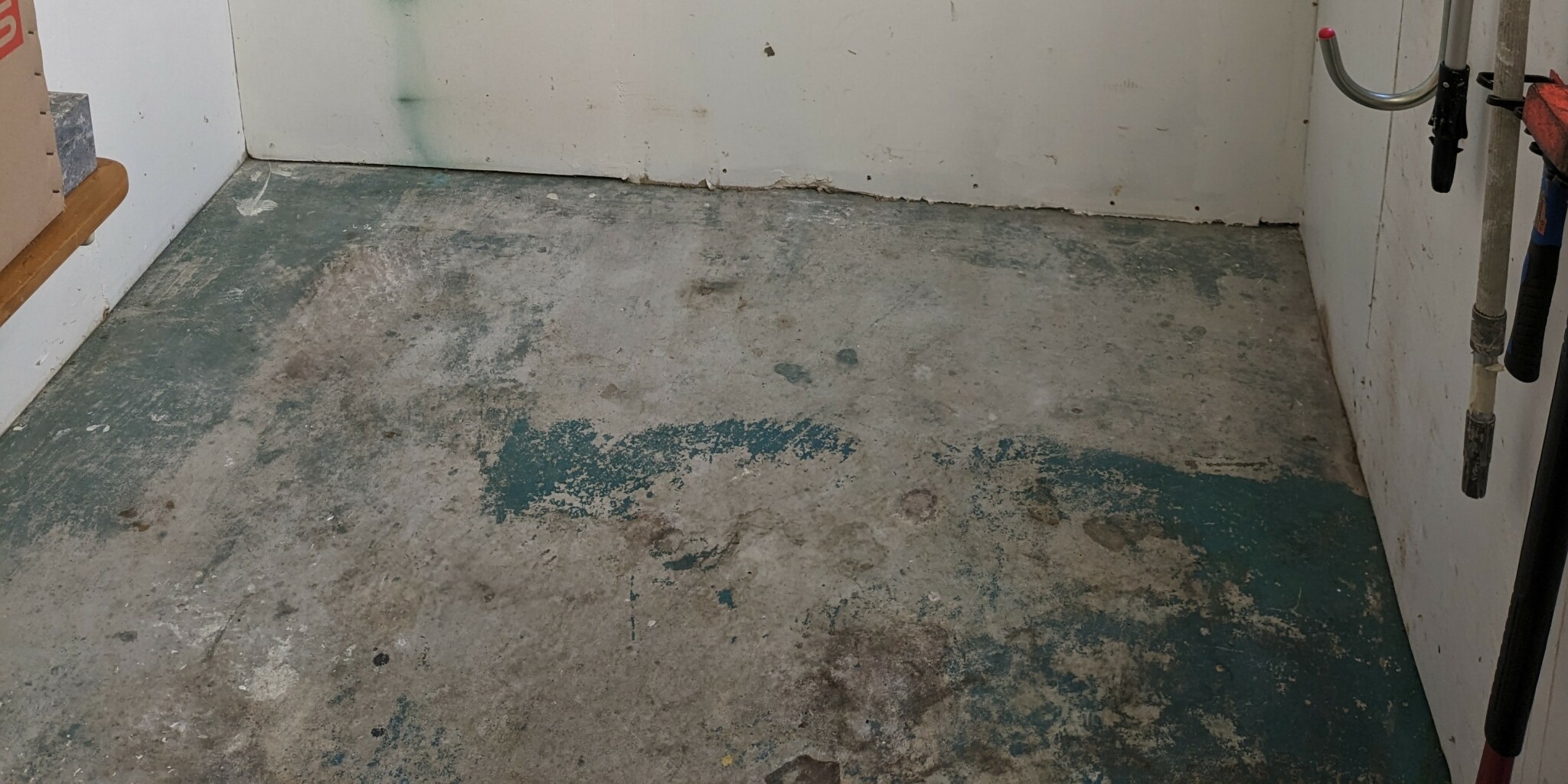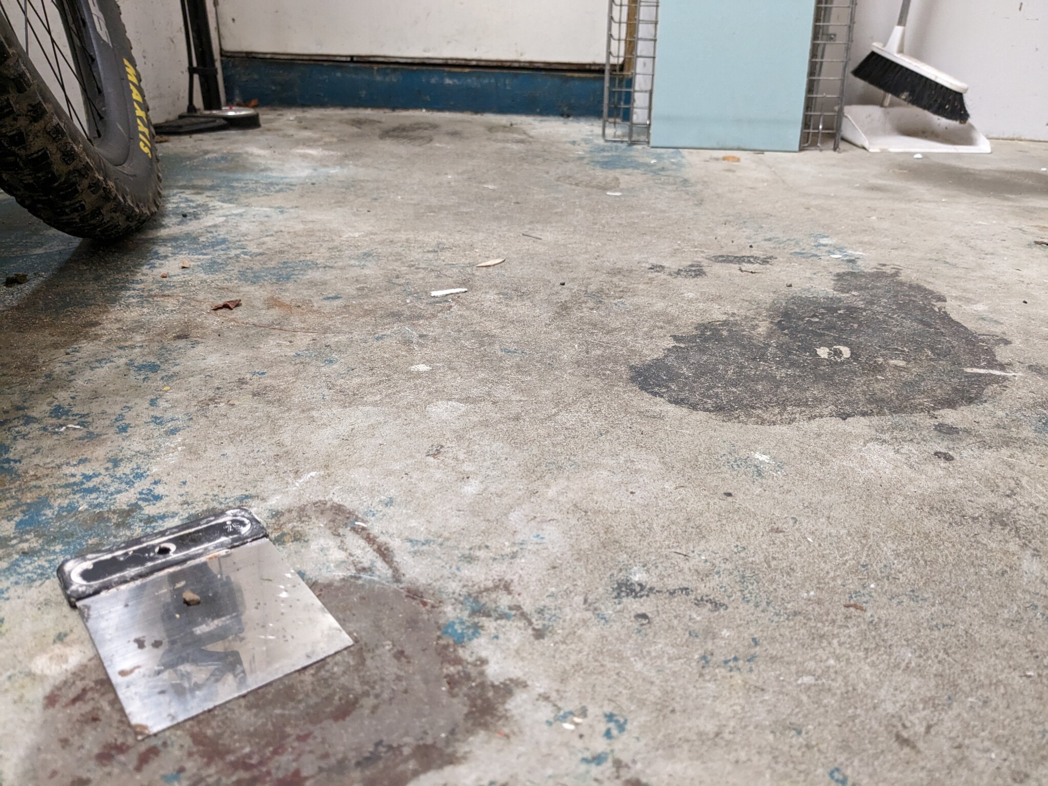 Betonggolvet i förrådet hade rester av gammal färg, fläckar av olja, vaxaktigt guck, spilld tjock målarfärg, lim, och annat okänt.