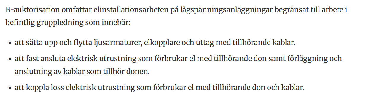 I tjänst ingår elektrikern i företagets egenkontrollprogram och därmed behörig att utföra elinstallationer.