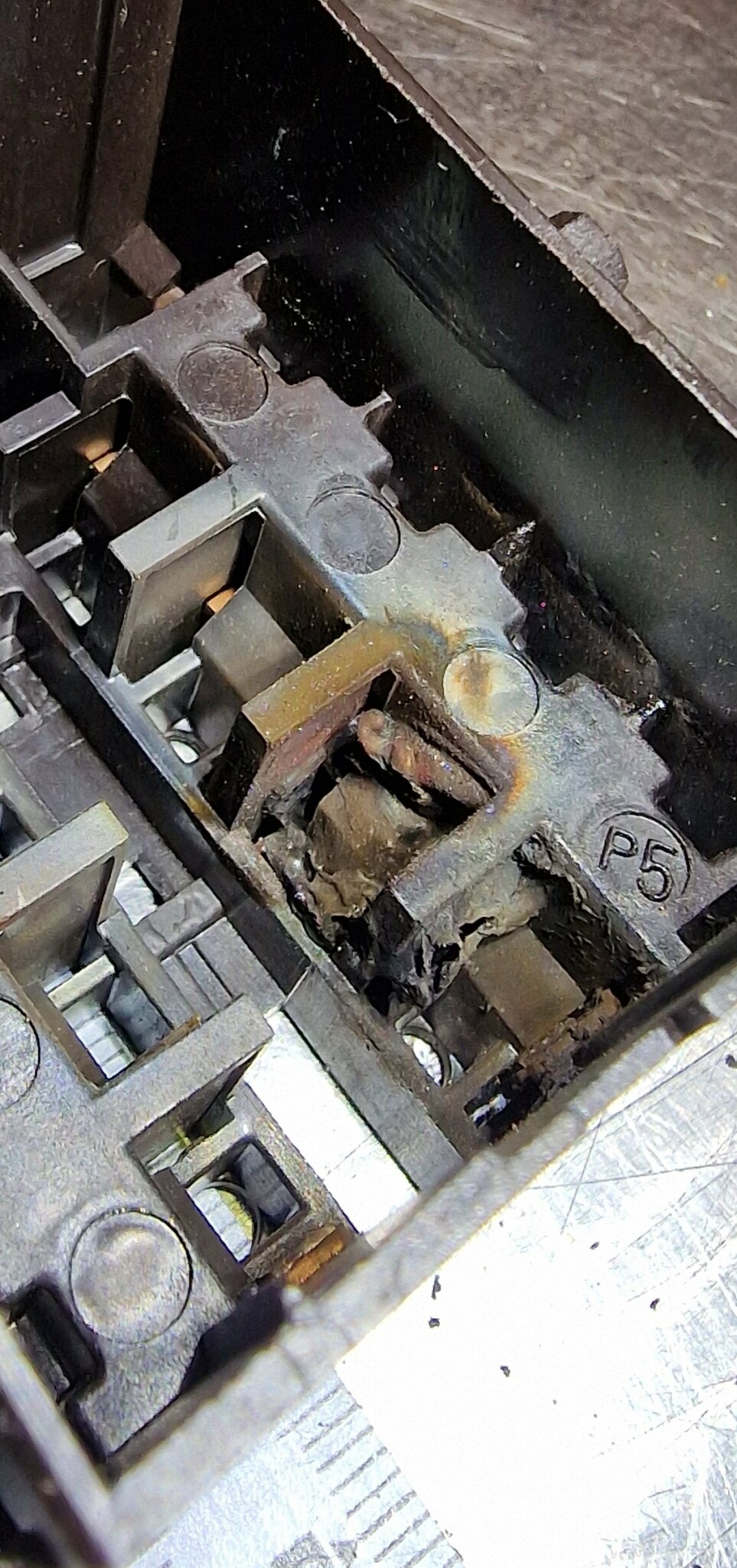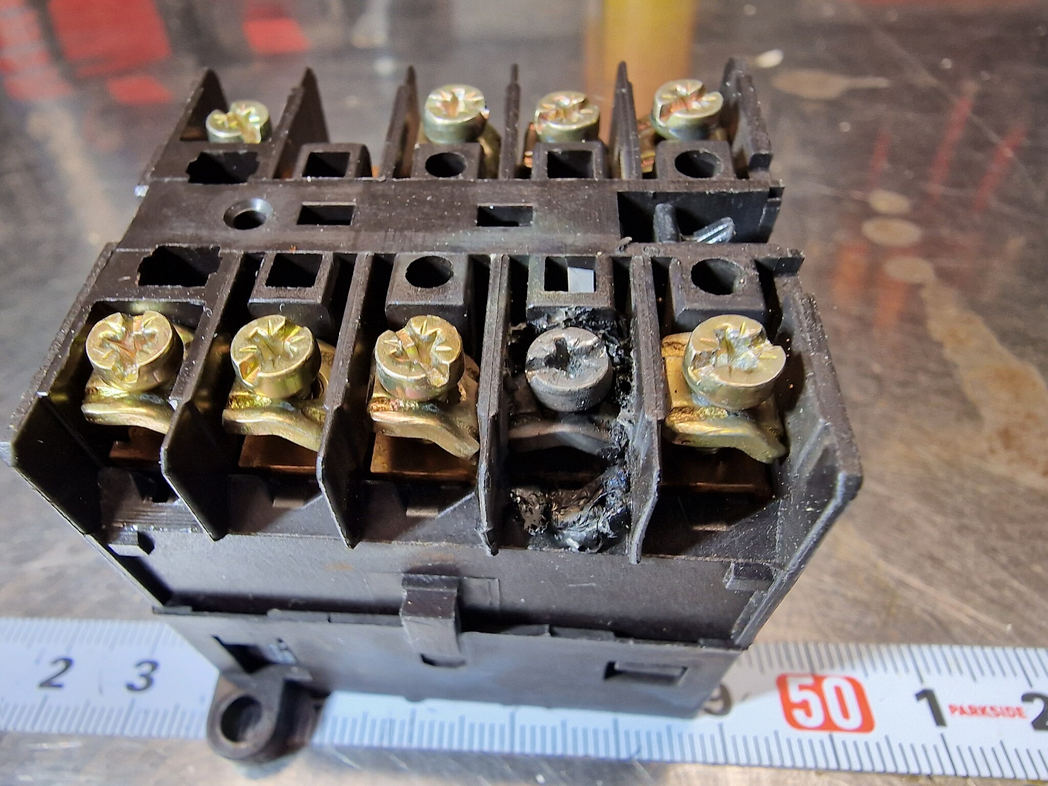 En 3-polig kontaktor där en ledare inte har varit rejält åtdragen från montering. Bara tur att det inte svetsat mer. På bild2 ser man insidan där två faser brunnit ihop
