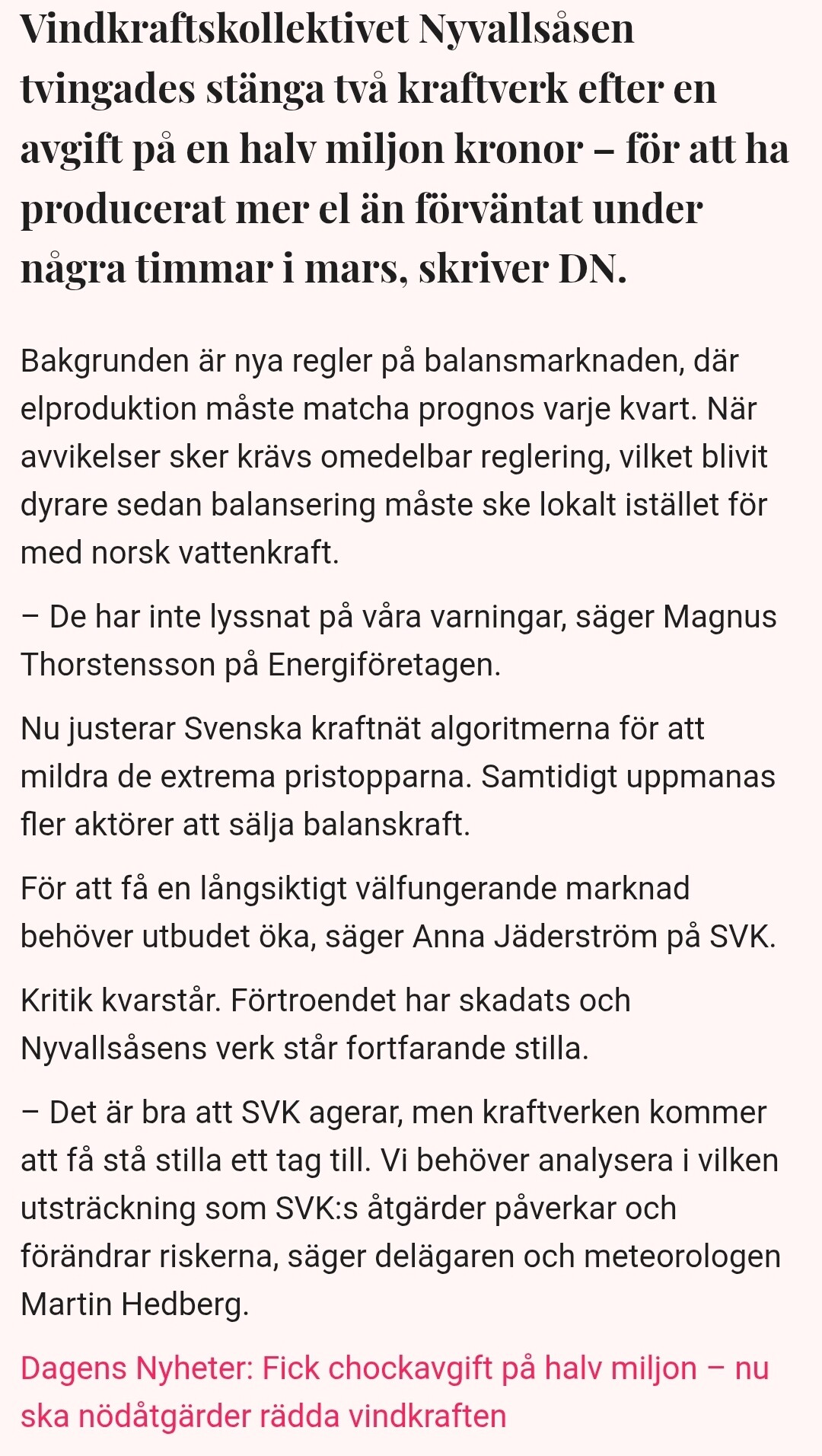 Du kan inte ha läst att leverera så mycket det går i alla lägen är optimalt, är min åsikt.D Daniel 109 skrev:Sol och vindkraft är reglerbart. Jag begriper inte varför du tror att den måste leverera så mycket det går i alla lägen.