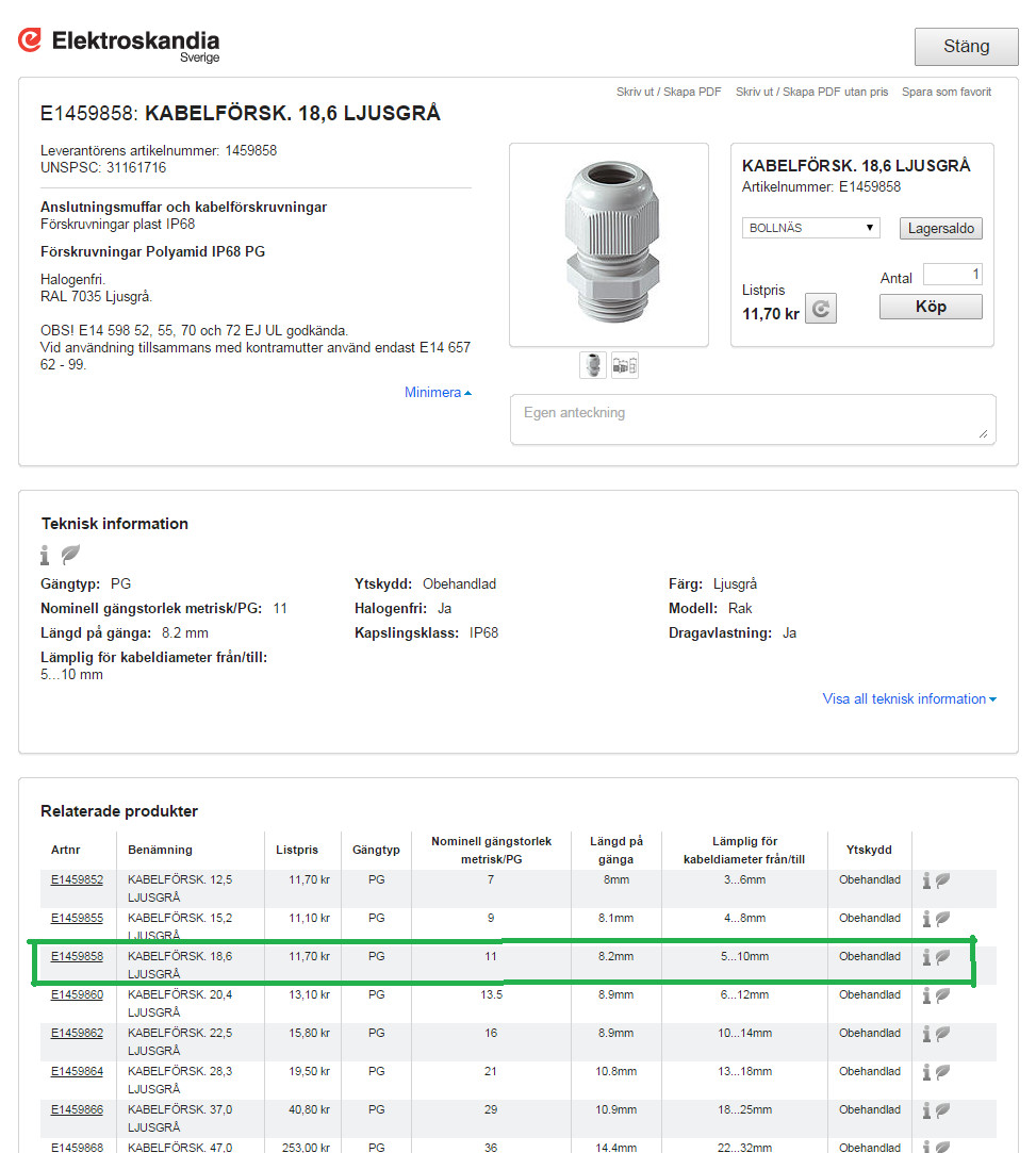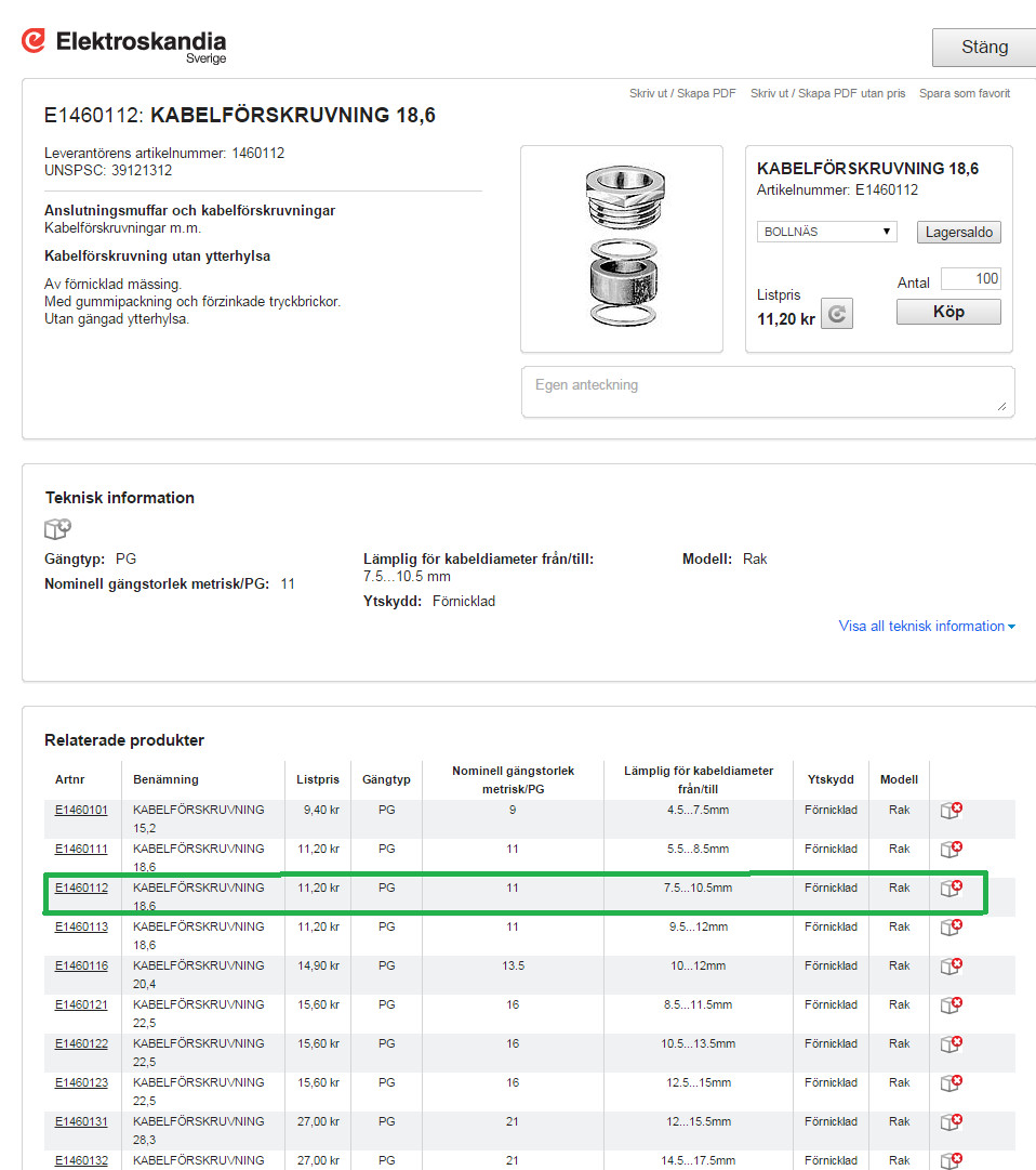Jag märkte när jag skulle börja koppla med den att förskruvningarna inte passar till EKLK3g1,5 kabel då den verkar vara dimensionerad för större kablar. Min fråga är om det finns förskruvningar som passar till denna kabel. Eller hur brukar detta problem lösas?