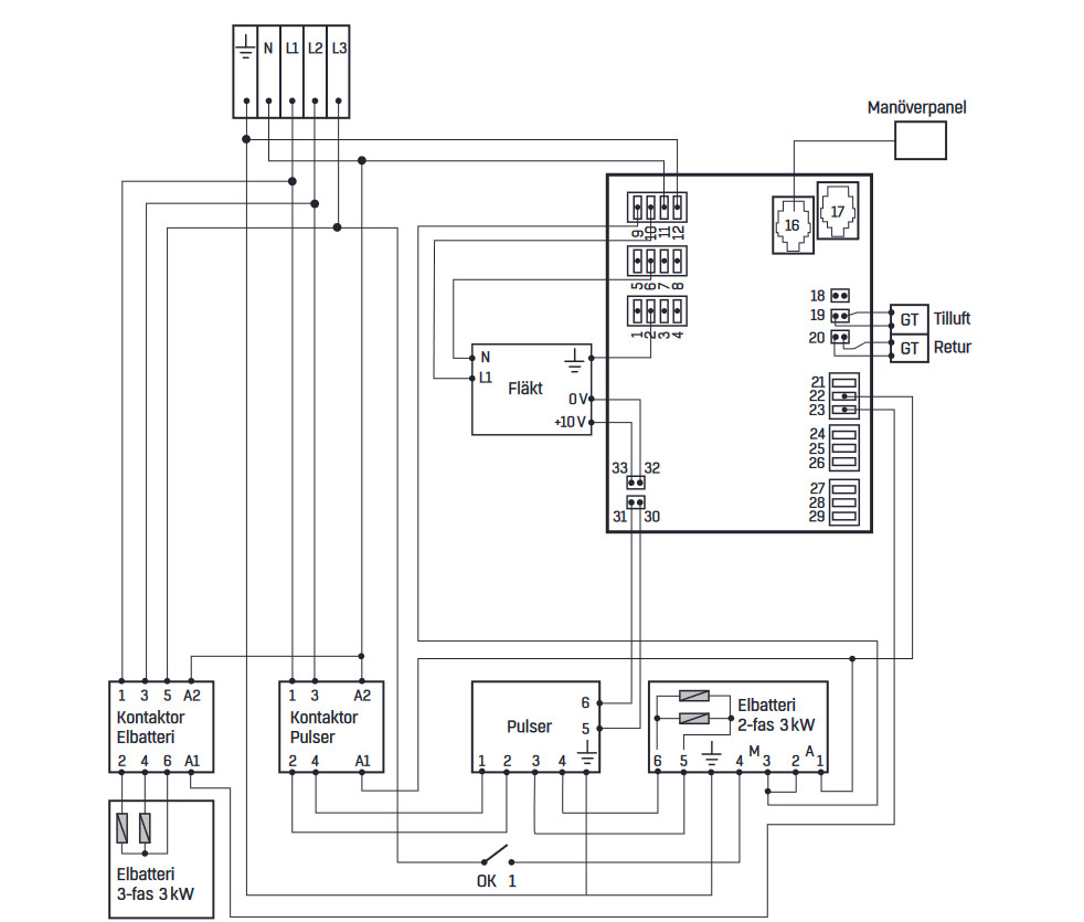 Är L2-L3 igång är går strömmen genom högra värmeelementet