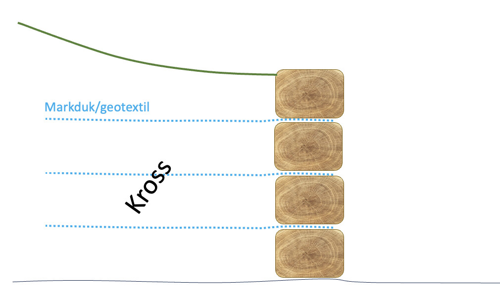 Annars räcker det nog gott med enbart byggtimmer och lager med markduk/geotextil för varje varv av byggtimret som är fäst i det och går in i marken bakom. Så rasar inte muren. Sen behöver ju byggtimret fogas ihop med stål också.