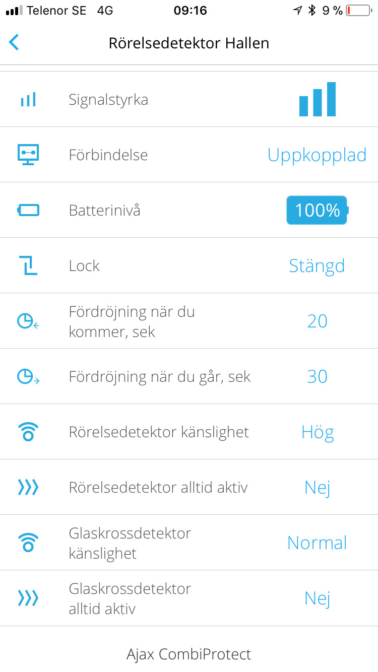 Här är en bild på inställningarna i vår CombiProtect. Tror bara det fanns möjlighet att välja Ja eller Nej på ”Glaskrossdetektor alltid aktiv”. Har man nej kan det ju ändå innebära att den är igång vid skallskydd. Bra fråga! Jag kan testarichardtenggren skrev:
