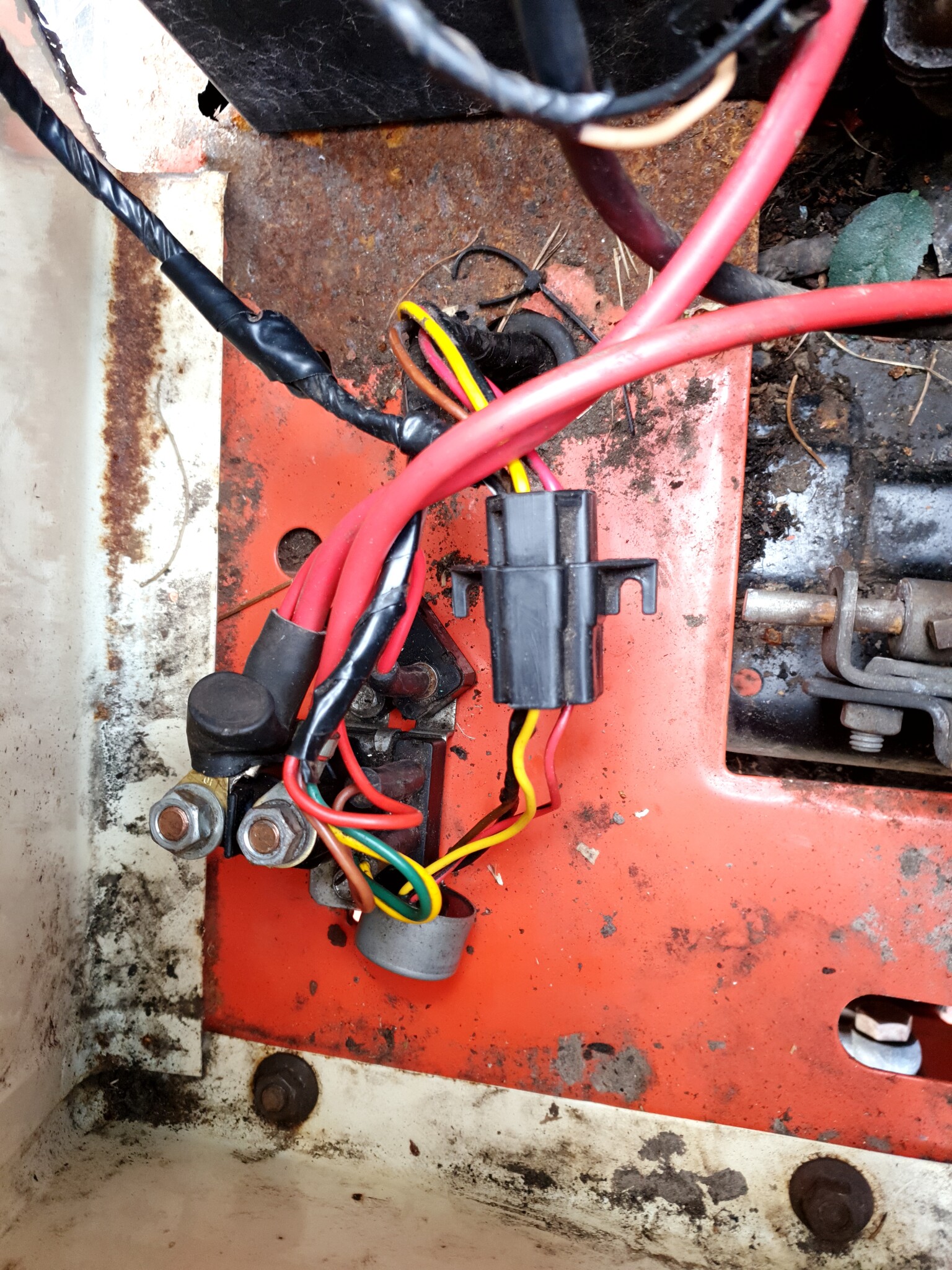 Prylen ovanför startreläet ser man inte helt. Det skulle kunna vara en laddregulator. Den är i så fall helt orelaterad till både att den stannar och att den inte startar. Se bara till att du har ström i batteriet.