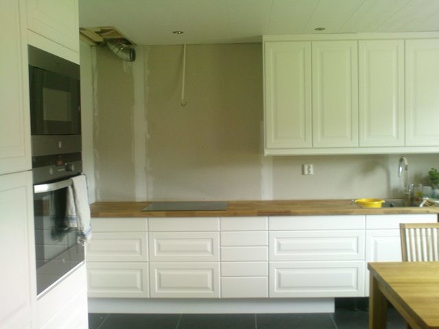 Köket börjar nu att bli klart och ska kaklas nästa vecka. Innan dess (nu i helgen) måste jag bygga in fläktröret på något sätt. Trodde att man skulle kunna dra om röret i bjälklaget och dra ner fläktröret precis över spishällen (där fläktkåpan ska sitta), men det gick inte.