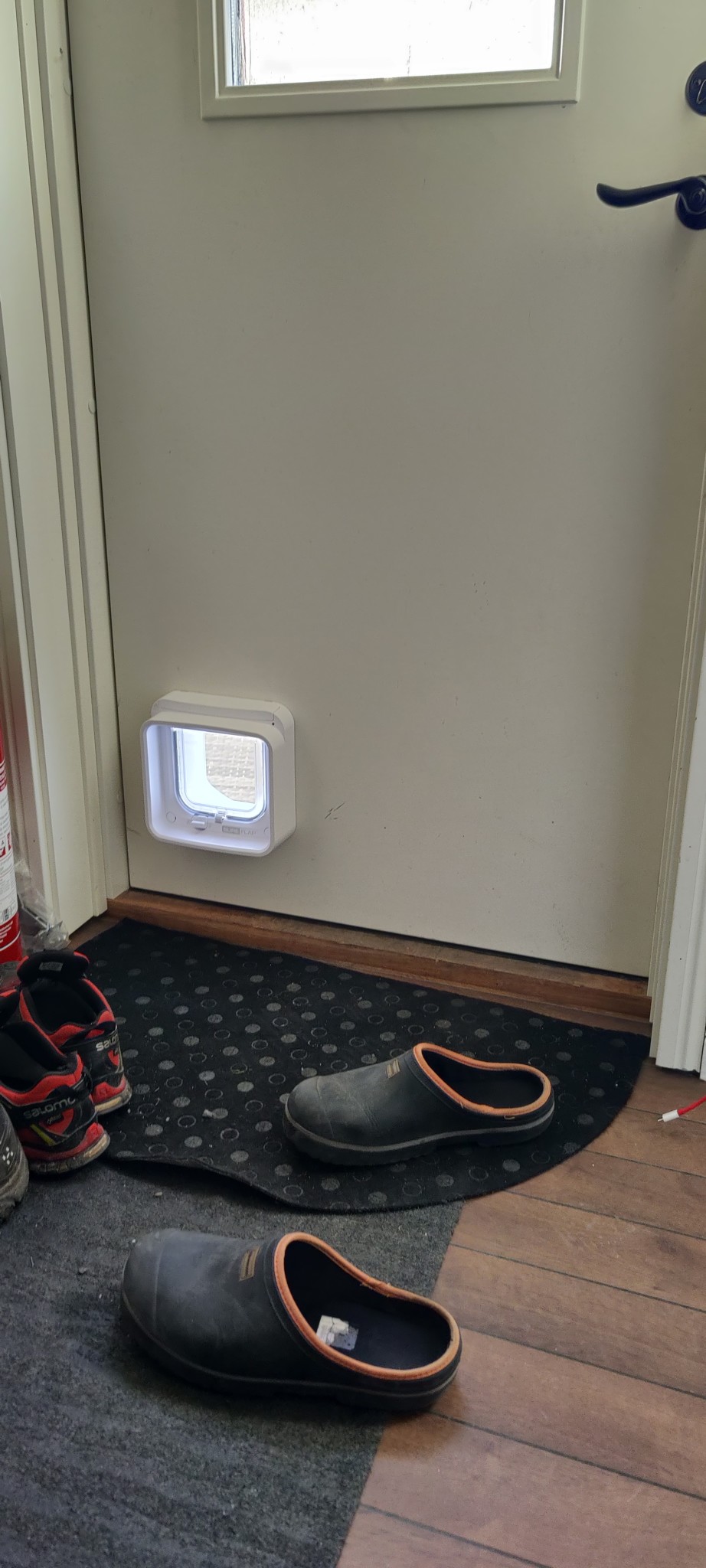 Kattluckan monterades i måndags, kändes sådär att sätta borr och sticksåg i dörren.