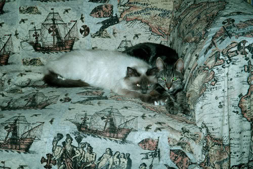 Malte, här på två bilder, den ena med Birma-honan Trixie som startade min kattkarriär den andra med hans helvita bror Molle. Hämtade de tillsammans. Mamman var en turkisk van och pappan okänd, troligen en norsk skogskatt.
