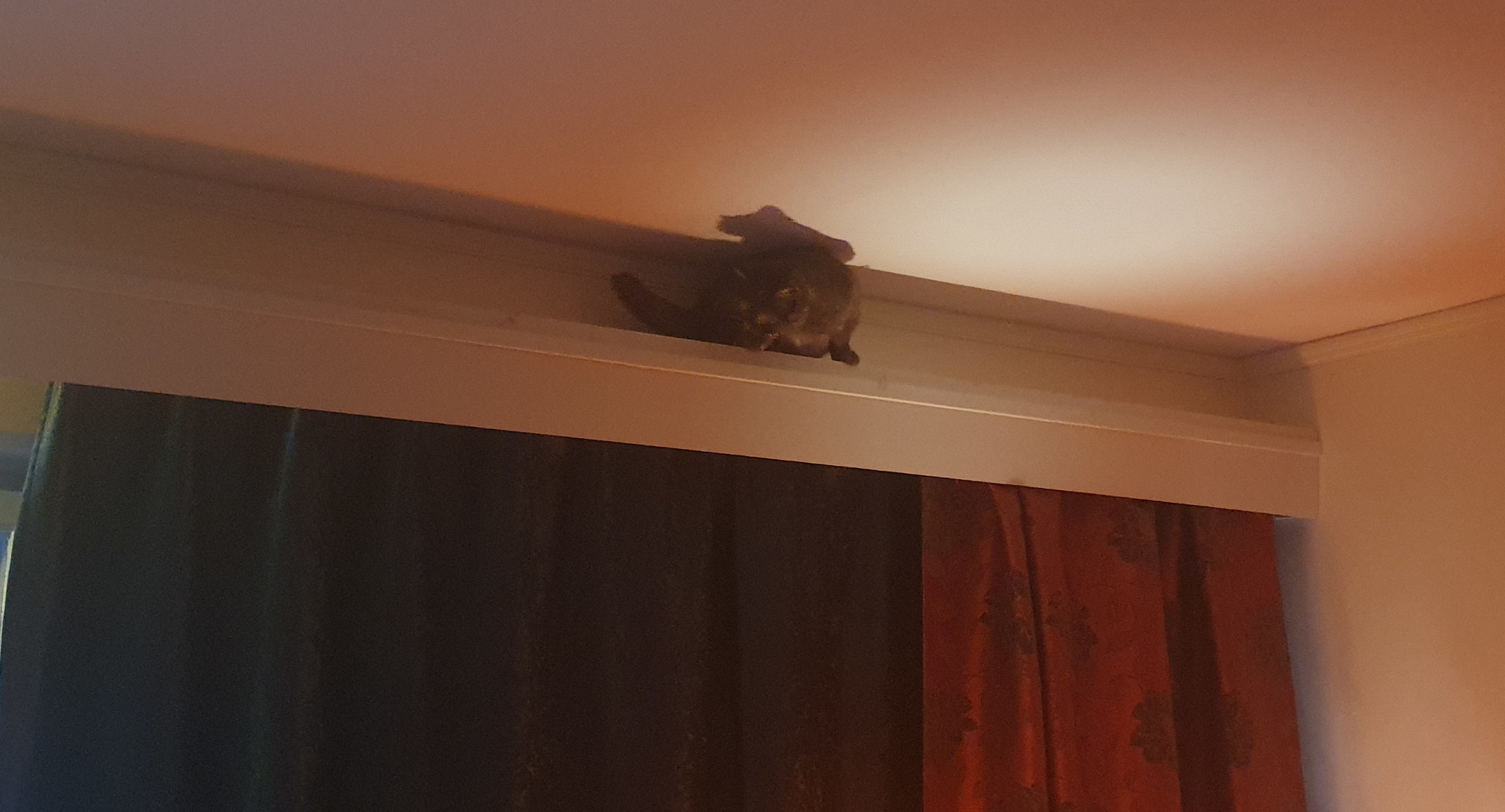 Här lyckades hon inte ta sig ner, klättra upp för gardiner är tydligen lättare än att ta sig ner. Tur att jag gjorde kornishen stadig! (är det någon som vet var det går att köpa guldlist? Hittade ingen när jag letade)