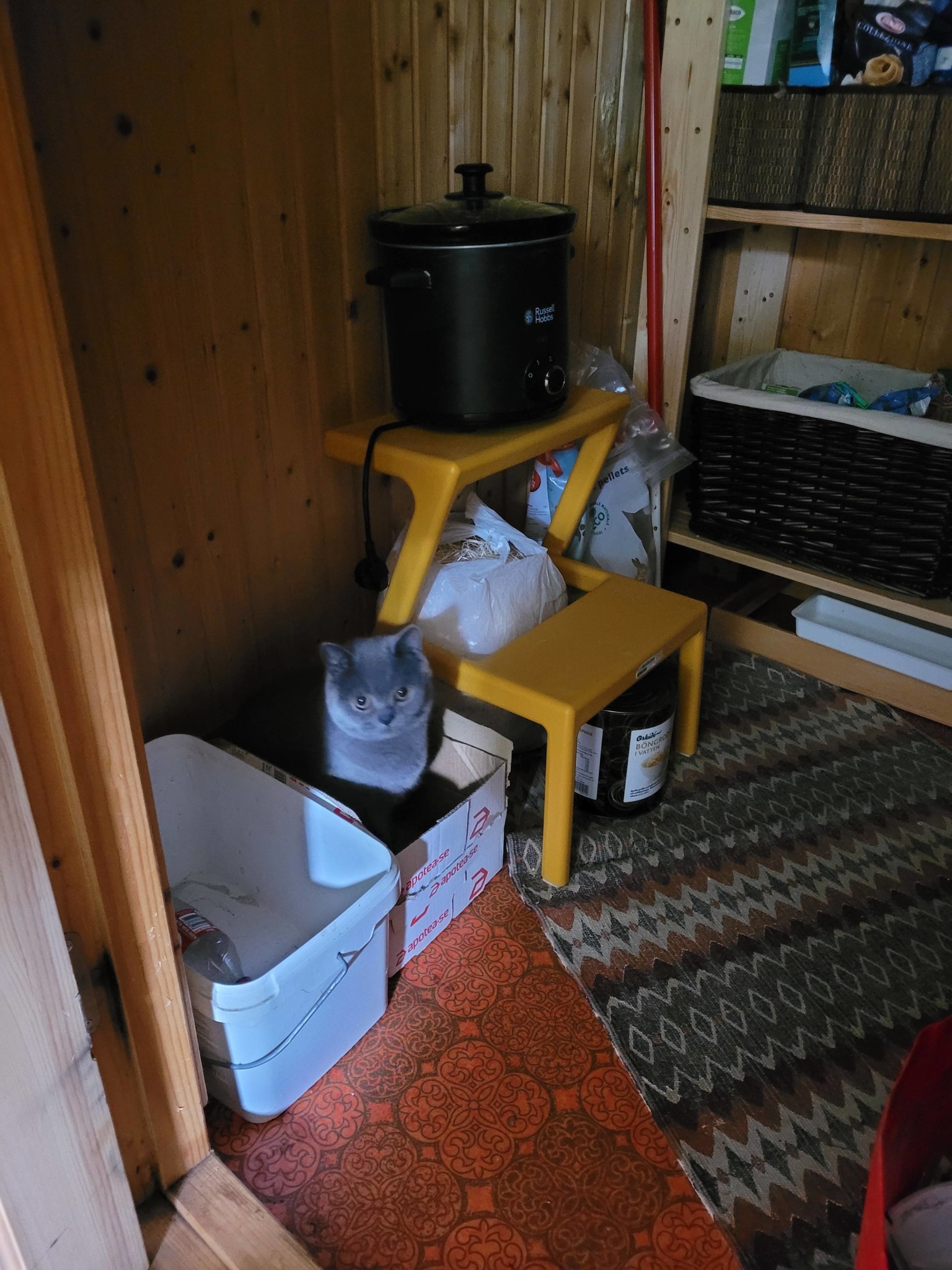 I köket har vi ett walk-in-skafferi, vilket katten älskar att smita in i så fort dörren öppnas. Han har blivit instängd x antal ggr, eftersom han alltid springer in ljudlöst bakom ryggen på en. Idag hittade han en kattong att provsitta i.