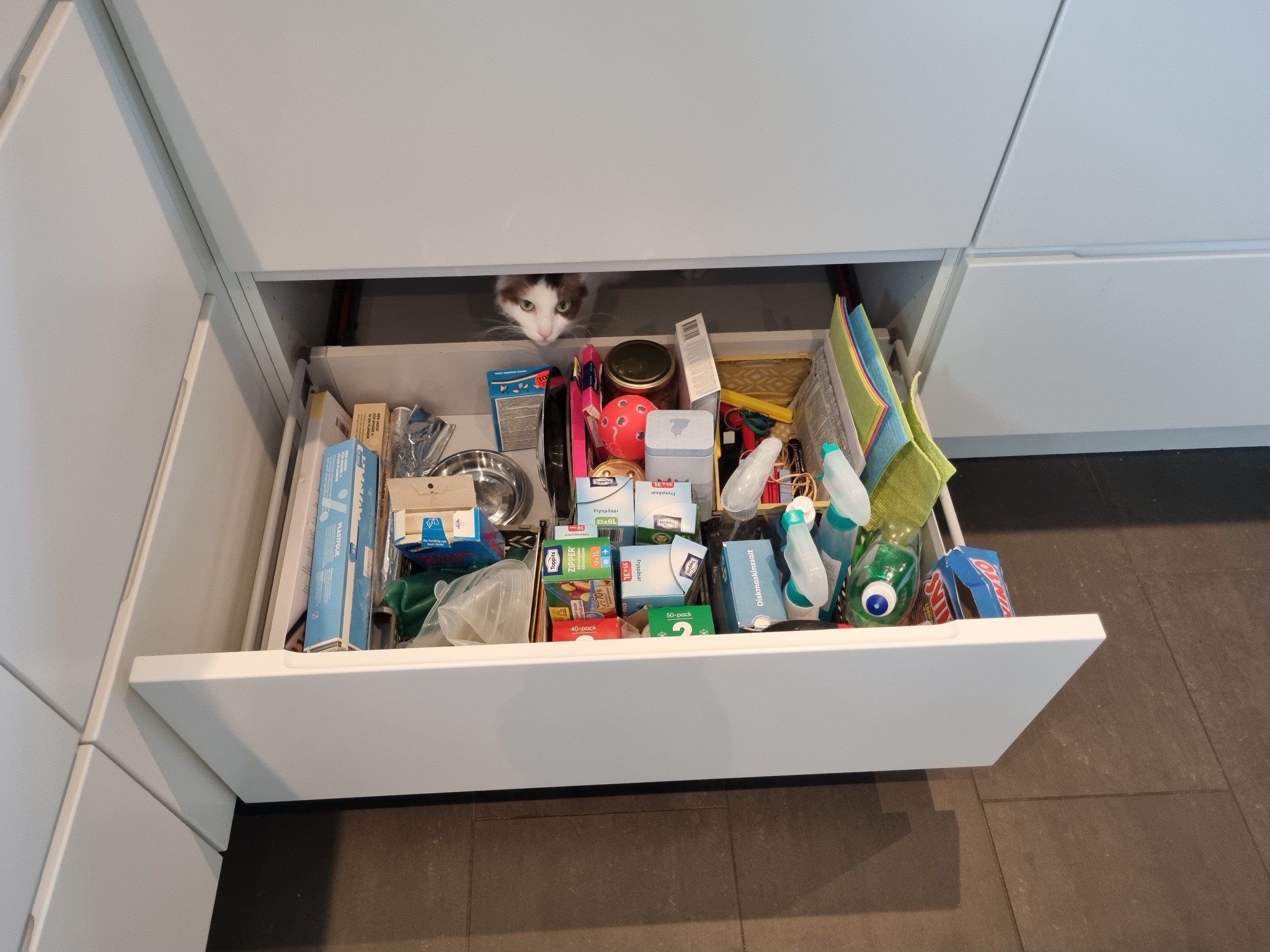 Det händer frekvent att katterna smiter in i köksskåp/lådor - oftast märks det när man försöker stänga.