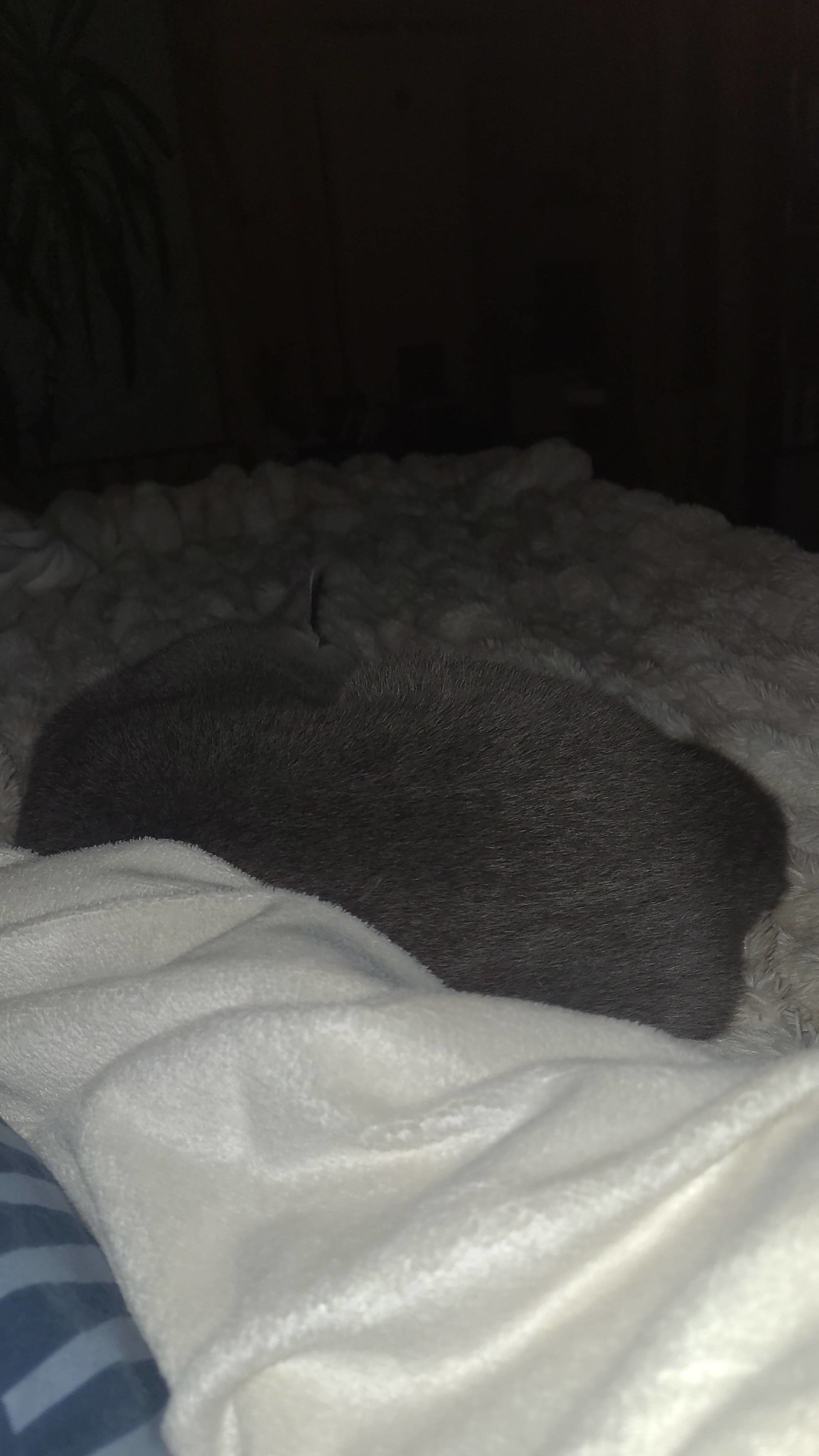 Igårkväll när jag gick och la mig kom han upp i sängen, trampade runt en stund bakom ryggen på mig och sov sen där hela natten. Det händer, men det är långt från varje natt, och han är definitivt inte en kelig knäkatt. Jag tolkar det som att han var glad att vara hemma igen.