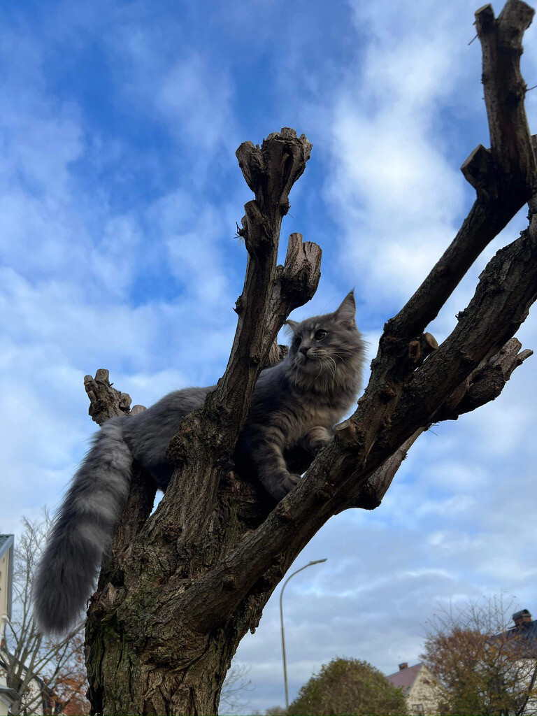 Han klÀttrar upp dÀr sÄ fort han kommer ut. Det gjorde Doris ocksÄ innan, men just nu har hon knölar i pÀlsen sÄ att det gör ont nÀr hon klÀttrar. Hon ska till veterinÀren och fixa pÀlsen nÀsta vecka. De mÄste ge henne lugnande först. Vi lyckas inte reda ut hennes pÀls sjÀlva.