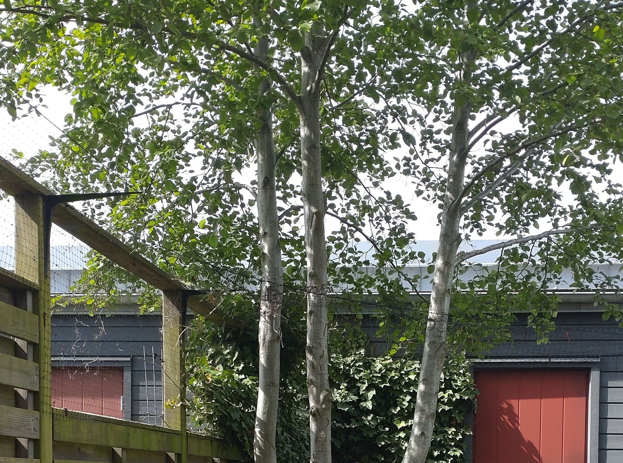 Förstora bilden så tror jag att du ser. Här har vi också satt ett nät vid träden. Det är som ett segel som går ut så att Katten inte kan klättra upp för stammarna. Jag har klippt upp och sytt igen med fallskärmslina.