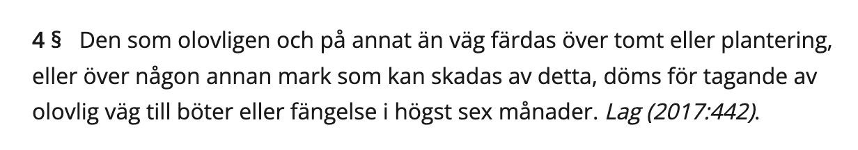 Vi kan väl säga att om ens agerande kan klandras utifrån brottsbalken så har man garanterat gått över gränsen för allemansrätten. Regleringen där:Mikael_L skrev: