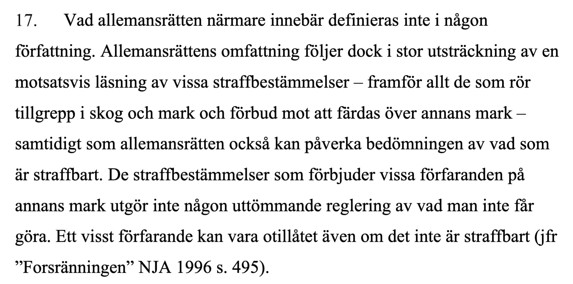 De skriver ju framför allt att färdas till fot. Det utesluter ju inte andra sätt att färdas, utan säger mer att det är det allra vanligaste sättet att utnyttja allemansrätten.M Maijckel skrev:När Högsta Domstolen i veckan avgjorde målet ”meteoriten” lyftes i domen begreppet allemansrätten. Det är nästan 30 år sedan HD närmare redogjorde för detta begrepp. Man justerar nu sin beskrivning och skriver: