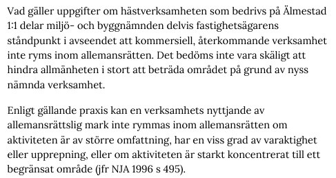 Vi kan därmed konstatera att ridning ingår i allemansrätten så länge som det inte är av sådan omfattning att det kan förorsaka påtagliga olägenheter eller skador så att det föreligger skäl att begränsa allemansrätten. Länsstyrelsen skriver dock "Mark- och miljööverdomstolen har genom avgörande (MÖD M 11873-21) konstaterat att andra avhållande åtgärder som begränsar den allemansrättsliga tillgången fullt ut, under vissa omständigheter har varit godtagbara." Men den domen, som alltså begränsade ridning, är alltså en begränsning av den allemansrättsliga tillgången, dock godtagbar under de förutsättningarna som rådde i det fallet. Alltså kan man även i det fallet konstatera att ridning omfattas av allemansrätten, men den får alltså trots det begränsas i vissa fall under vissa förutsättningar. Notera att i detta fall med kommersiell ridverksamhet på vägen så var ridverksamheten inte skäl nog att begränsa framkomligheten, och det var Markägarna som inte hade påvisat tillräcklig skada eller olägenhet. Alltså kan vi konstatera att ribban förefaller ligga högt om nyttan för det allmänna anses vara stor och området är av sådan betydelse för friluftslivet som avses i 26 kap. 11 § första stycket miljöbalken.