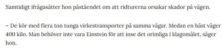 Vad gäller timmertransporter får man ju beakta att det är en kommersiell verksamhet som ger nytta åt markägaren som då kan sälja sitt timmer, medans ridning är ett nöje för en besutten överklass som inte betalar för sig. Och till skillnad från dieselavgaser luktar hästar och hästskit illa.