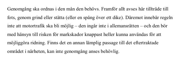 Samtidigt beskriver propositionen också att allemansrätten får tolkas motsatsvis olika straffstadganden och poängterar att det som är allmänt accepterat ingår (och dessutom att fastighetsägaren får en inskränkning utan ersättning).M Maijckel skrev:Tack för att du inte tar illa upp. Jag uttrycker mig utan tvivel en aning ofint emellanåt men att vi åtminstone är överens om det fria ordets välsignelse uppskattas. Jag uppskattar även sakligt motstånd här i tråden som du bidragit med i några timmar av din tid. 👍