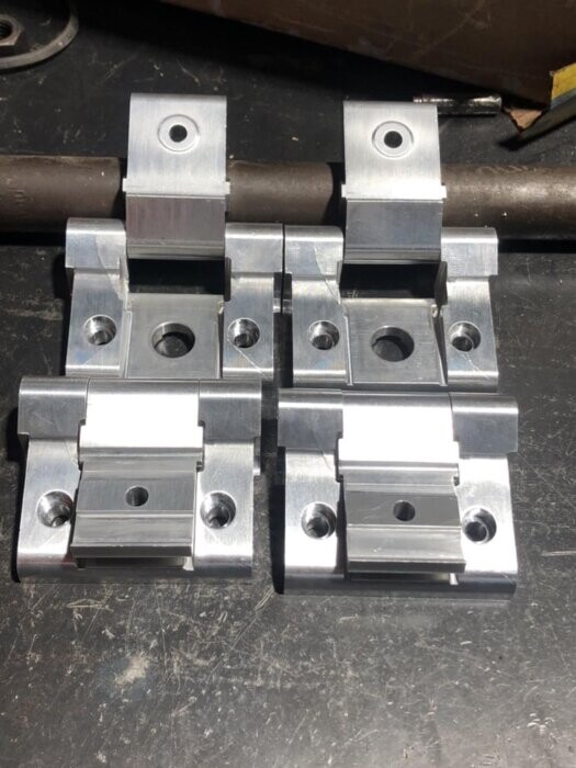 Jag tröttnade på att köpa begagnade gångjärn som bara höll några månader, och tillverkade istället egna i mässing till mina garageportar. De verkar funka helt ok, och excenterrörelsen verkar stämma på någon mm när. Enda förändringen jag behövde göra var att korta av skruvarna, eftersom mässingen är tunnare än plasten i originalet. Det går säkert att fixa med brickor också men det blir inte lika snyggt. Ska måla dem i samma färg som porten till sommaren så de smälter in bättre.